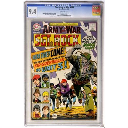 <B>Our Army at War #194 (DC, 1968) CGC NM 9.4 Off-white pages.</B></I> The kid fighters of Unit 3 who debuted in #189 made their first cover appearance here. Joe Kubert cover. Kubert and Jack Abel art. Overstreet 2007 NM- 9.2 value = $65. CGC census 6/07: 1 in 9.4, 1 higher. <I>From the Keith Marlow Collection.</B></I><BR><BR><b>Shipping:</b> Comics - Slabbed (certified) (<a target="_blank" href="http://www.heritageauctions.com/common/shipping.php">view shipping information</a>)