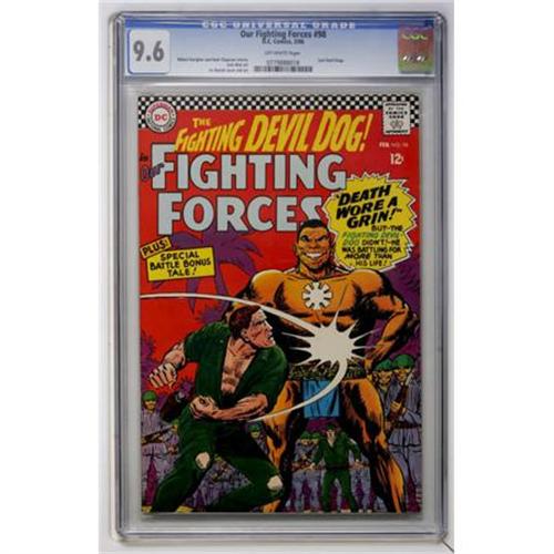 <B>Our Fighting Forces #98 (DC, 1966) CGC NM+ 9.6 Off-white pages.</B></I> Last Devil Dogs. Irv Novick cover and art. Jack Abel art. Overstreet 2007 NM- 9.2 value = $45. CGC census 6/07: 2 in 9.6, none higher. <I>From the Keith Marlow Collection.</B></I><BR><BR><b>Shipping:</b> Comics - Slabbed (certified) (<a target="_blank" href="http://www.heritageauctions.com/common/shipping.php">view shipping information</a>)