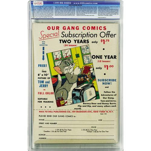 <B>Our Gang #24 File Copy (Dell, 1946) CGC NM 9.4 Off-white pages.</B></I> A kid-themed comic with a predominantly white cover has a pretty low chance of surviving for 60 years in NM condition, luckily this one remained unscathed in the files of Western Publishing! Overstreet 2006 NM- 9.2 value = $245. CGC census 3/06: 1 in 9.4, none higher. <I>From the Random House Archives.</B></I>