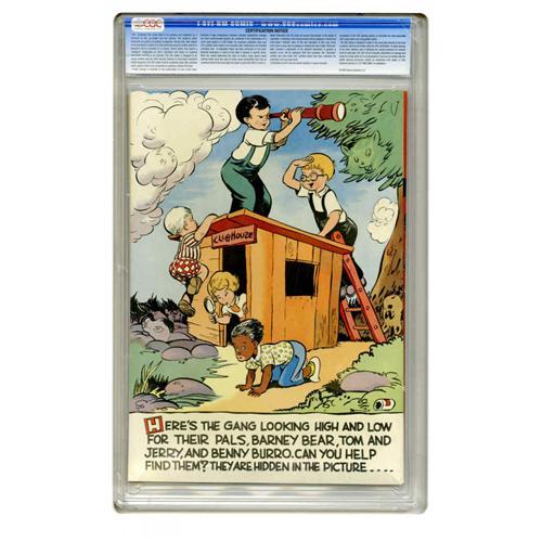 <B>Our Gang #7 File Copy (Dell, 1943) CGC VF+ 8.5 Off-white to white pages.</B></I> While Walt Kelly provides art for the front and back covers, the <B>Gang</B></I> story inside is by other hands. Overstreet 2005 VF 8.0 value = $160; VF/NM 9.0 value = $245. CGC census 11/05: 1 in 8.5, none higher. <I>From the Random House Archives.</B></I>