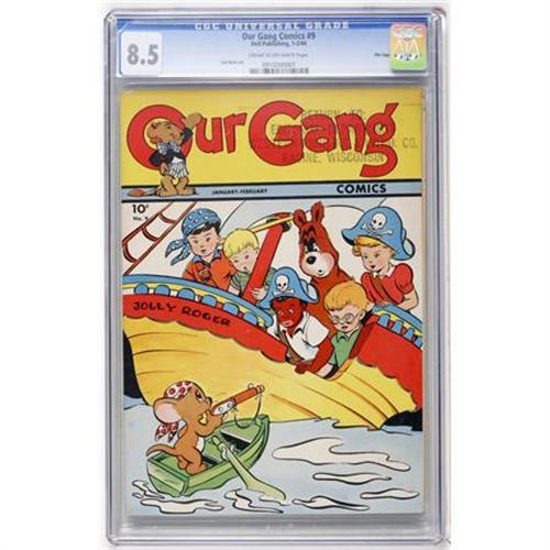 <B>Our Gang #9 (Dell, 1944) CGC VF+ 8.5 Cream to off-white pages.</B></I> Carl Barks art. Benny Burro and Happy Hound appearances. Bears a Western Printing file copy stamp on the cover. Overstreet 2007 VF 8.0 value = $336; VF/NM 9.0 value = $568. CGC census 1/08: 1 in 8.5, 1 higher.<BR><BR><b>Shipping:</b> Comics - Slabbed (certified) (<a target="_blank" href="http://www.heritageauctions.com/common/shipping.php">view shipping information</a>)