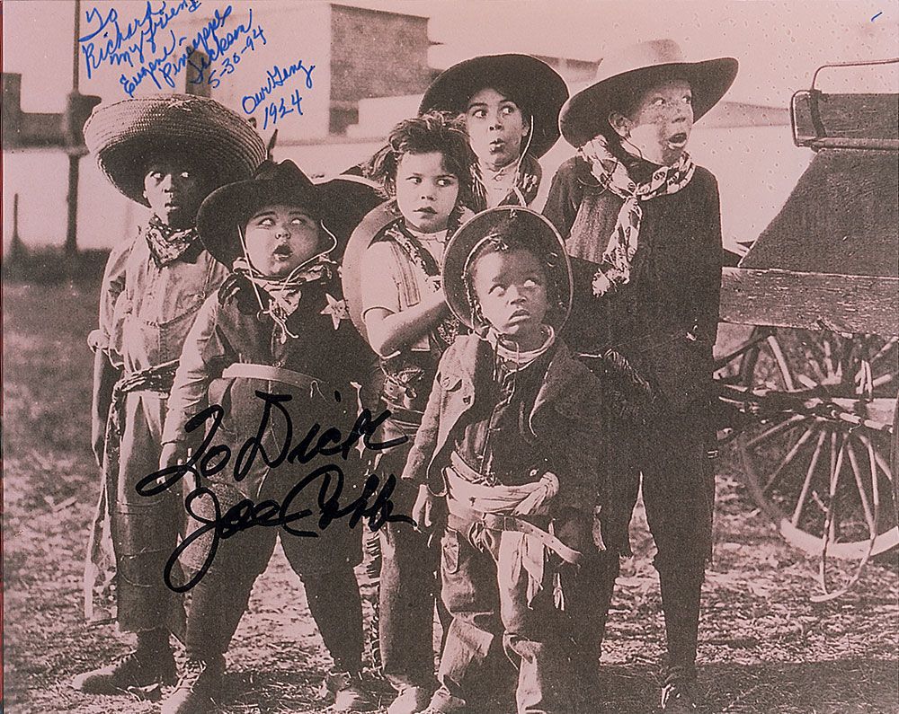 Glossy 10 x 8 photo of the awestruck gang, signed and inscribed in blue felt tip, “To Richard my friend, Eugene Pineapple Jackson, 5-30-94, Our Gang 1924,” and in black felt tip, “To Dick, Joe Cobb.” In fine condition.