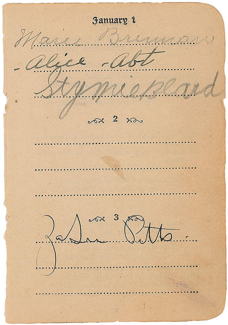 American actor (1925–1981), born Matthew Beard, best known for his role as Stymie in the popular Our Gang series of comedy shorts. Vintage pencil signature, “Stymie Beard,” on an off-white 2.25 x 3.25 daily planner page, also signed by Zasu Pitts and two others. Scattered toning and soiling, a couple creases, and a rough left edge, otherwise fine condition.