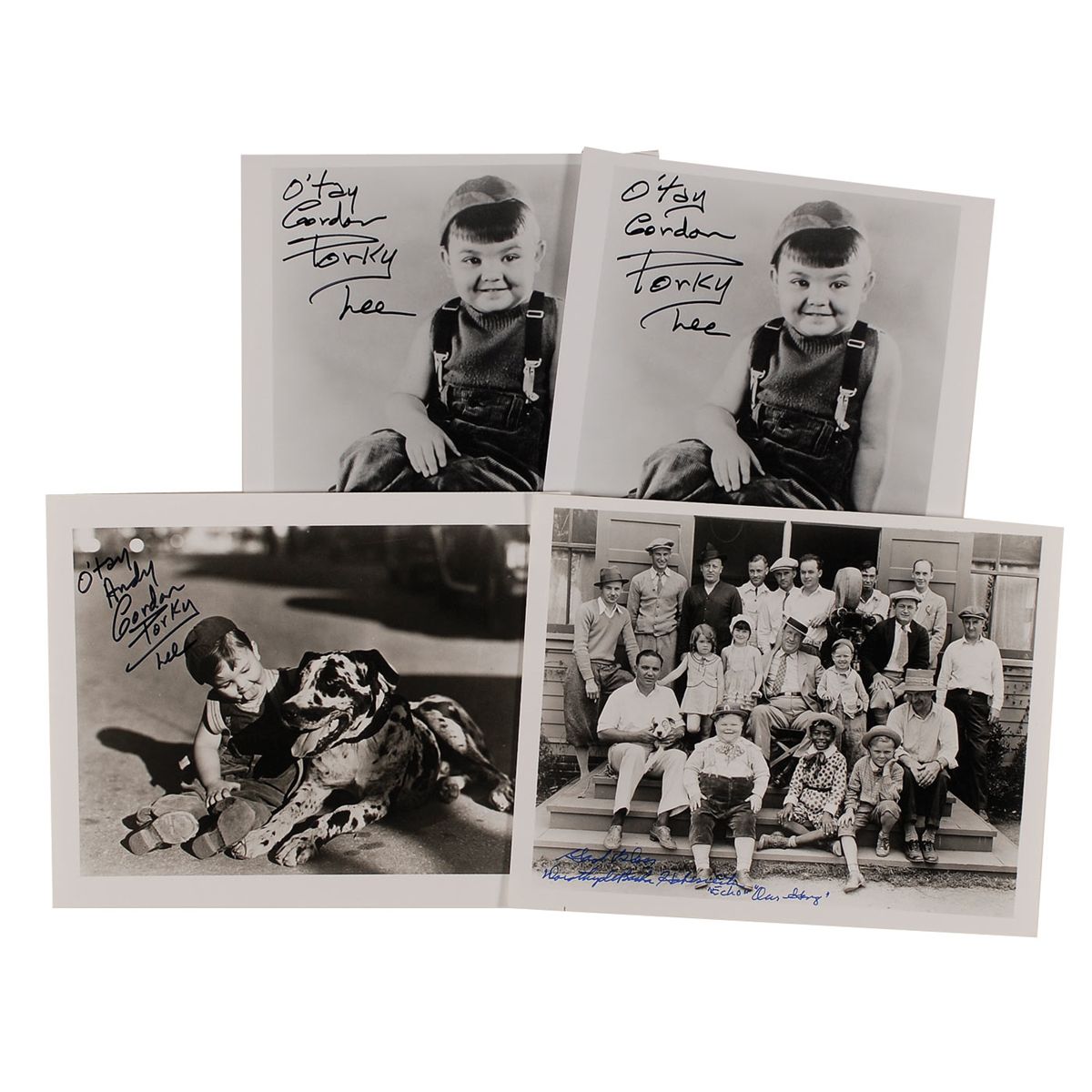 Glossy 10 x 8 Our Gang cast and crew photo, signed in blue felt tip, “God Bless, Dorothy DeBorba Hahemister, ‘Echo’ ‘Our Gang’”; and three glossy photos of Porky, two 8 x 10 and one 10 x 8, each signed in black felt tip, “O’Tay, Gordon ‘Porky’ Lee.” In fine condition.