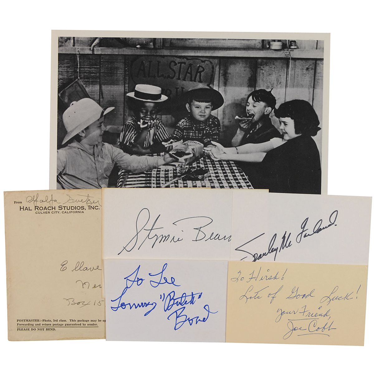 Five items: vintage Hal Roach Studios mailing envelope, 7.5 x 5.5, signed in the return address area, “Alfalfa Switzer,” and addressed in Switzer’s hand; and felt tip and ballpoint signatures of Spanky McFarland, Joe Cobb (ins), Tommy ‘Butch’ Bond (ins), and Stymie Beard on individual off-white cards. In overall fine condition. Accompanied by a certificate of authenticity from PSA/DNA for the McFarland signature.