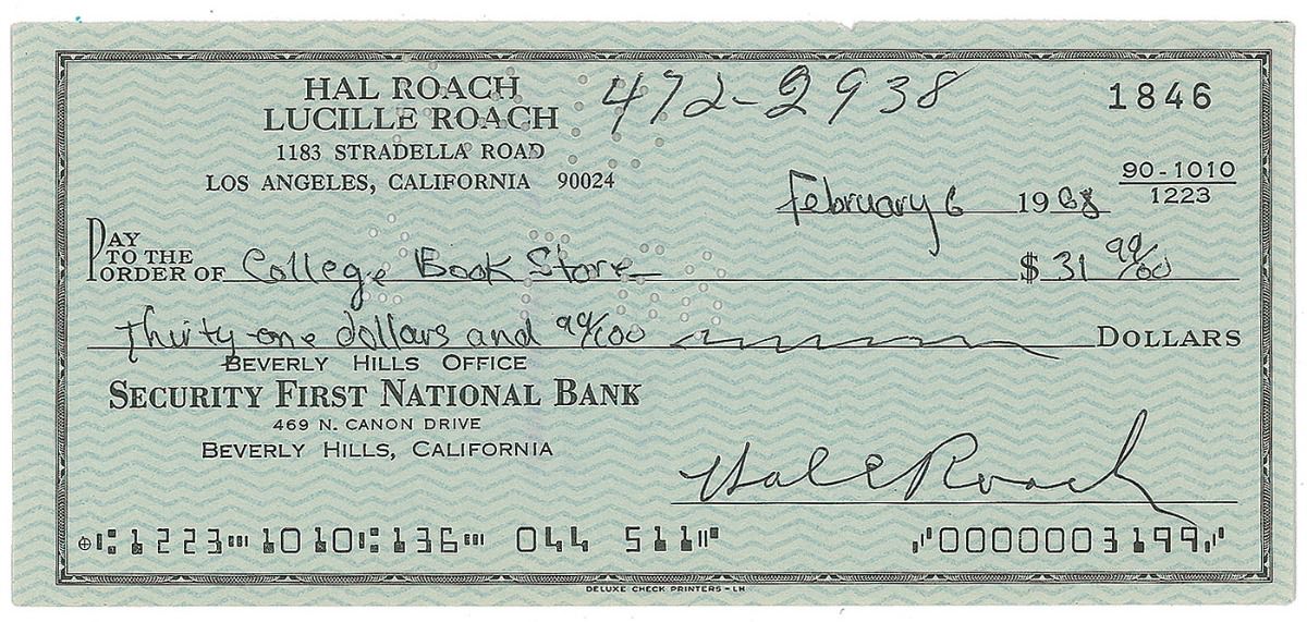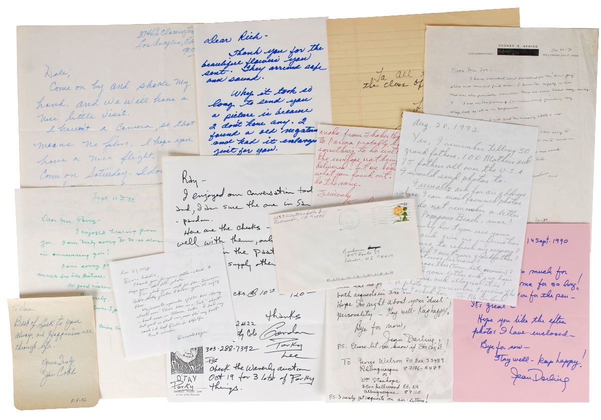 Collection of fifteen items, consisting of twelve letters, two checks, and a signed photo, including: Hal E. Roach (check), Joe Cobb (2 ALSs), Mary Ann Jackson (ALS), Matthew ‘Stymie’ Beard (ALS), Darwood Kaye (ALS), June Marlowe (2 ALSs and SP), Gordon ‘Porky’ Lee (ALS), Jean Darling (2 ALSs), and Spanky McFarland (2 ALSs and check). In overall fine condition. Accompanied by the original mailing envelope for the Kaye letter, addressed in his own hand.
