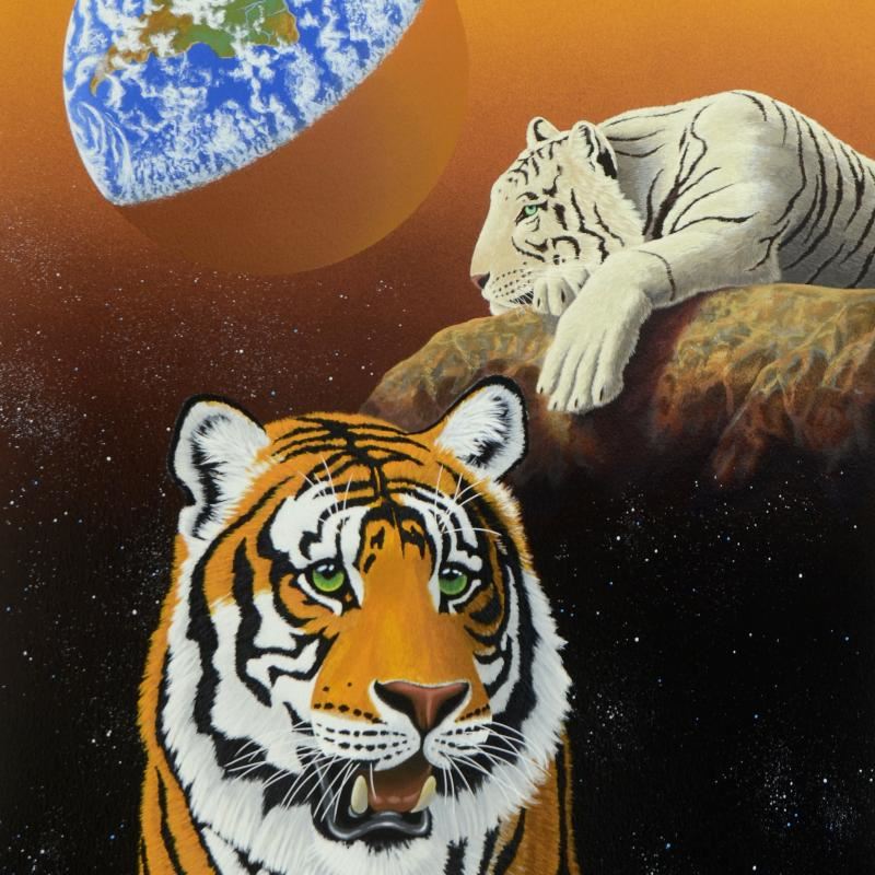 "Our Home Too III (Tigers)" is a limited edition serigraph on paper by William Schimmel, numbered and hand signed by the artist! Includes Certificate of Authenticity! Measures approx. 28" x 34" (with border), 22" x 28" (image).
