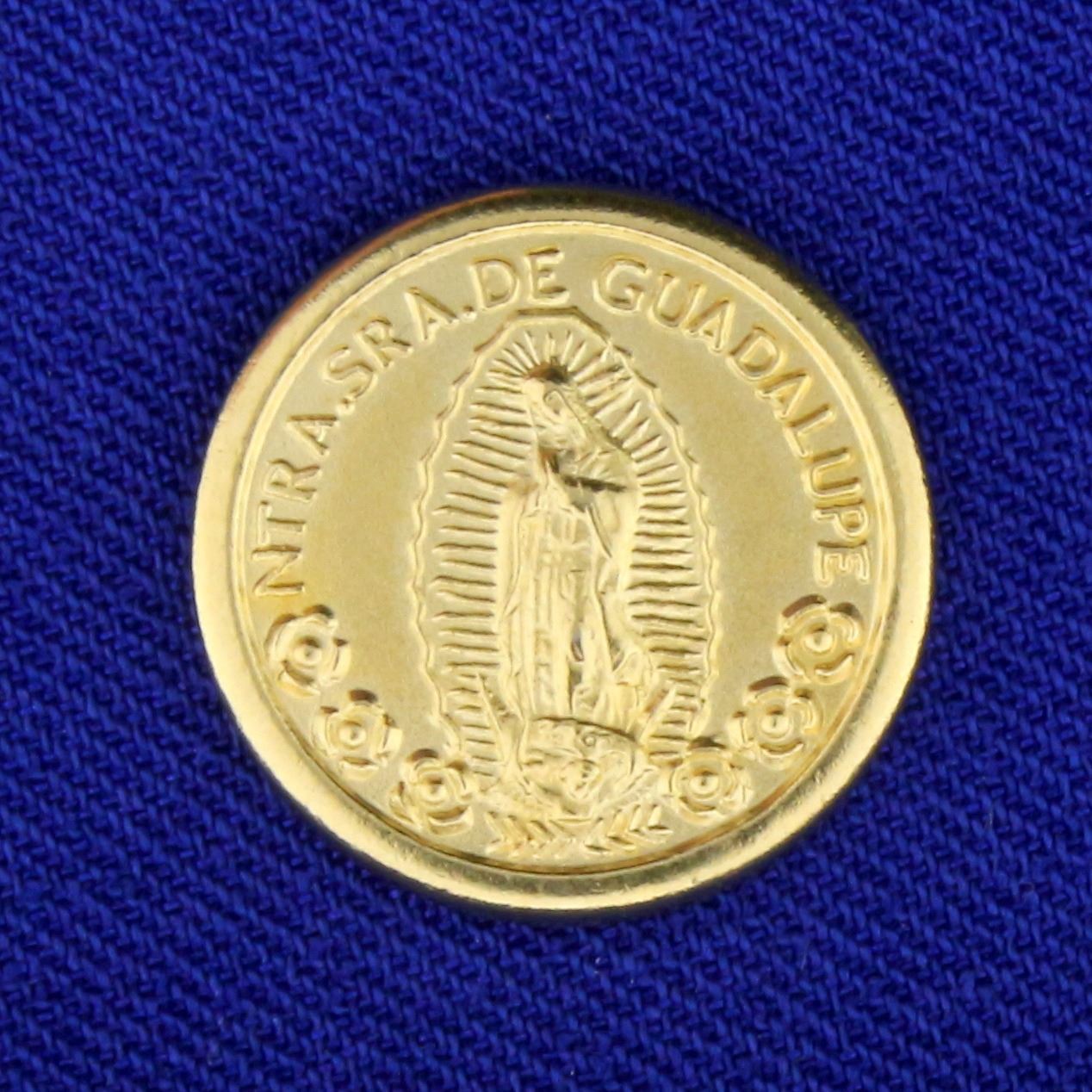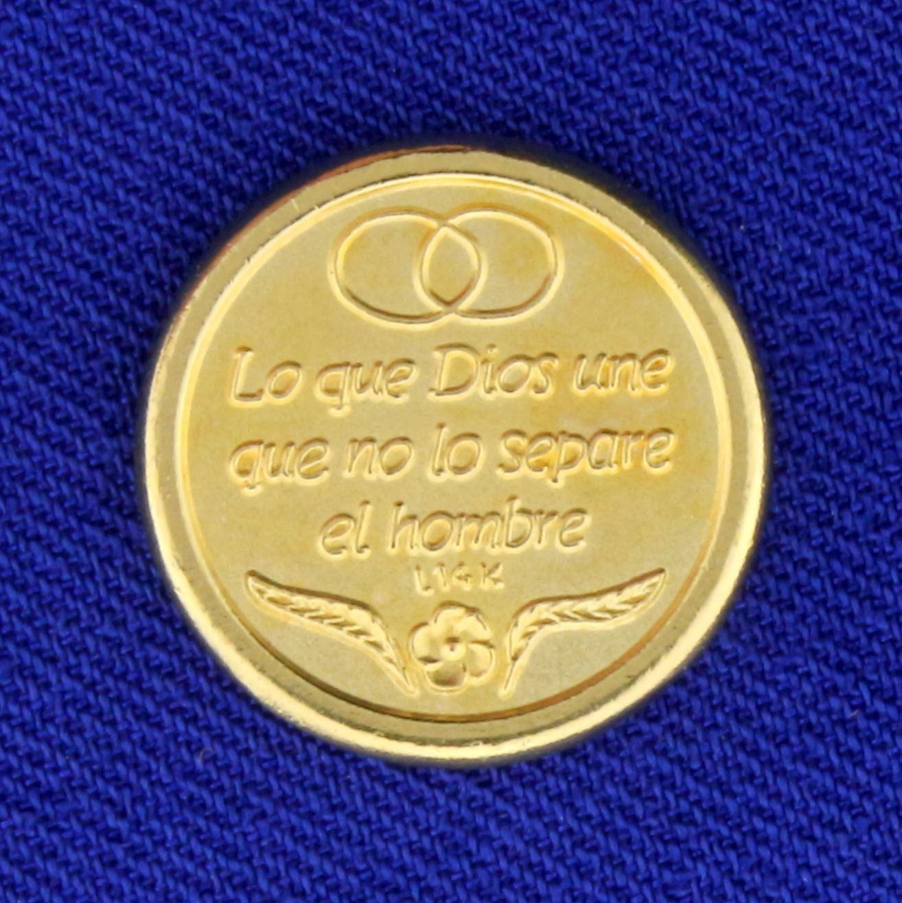 In 14K Yellow Gold. 1/2 inch diameter. One side has the Virgin Mary on it with the other side containing a Bible verse from Matthew 19:6. 2.3g.