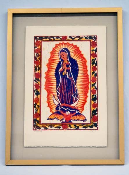 Our Lady of Guadalupe Signed & Numbered Print by R. Pijoan, # 1/11, framed and under glass, visual measures 11'' x 12.5'', FYI: ''Nationally know artist Randy Pijoan, his roots from Northern New Mexico and Central Colorado, has explored numerous corners of our contemporary world. From the vineyards of Tuscany and California, to the mountains of Northern Spain and Switzerland, into the back roads and desolate terrain of western expanse and even on the crowded streets of Portland and Chicago, Randy has shared his inspiration and perception through his art with thousands of people for over twenty-five years.''
