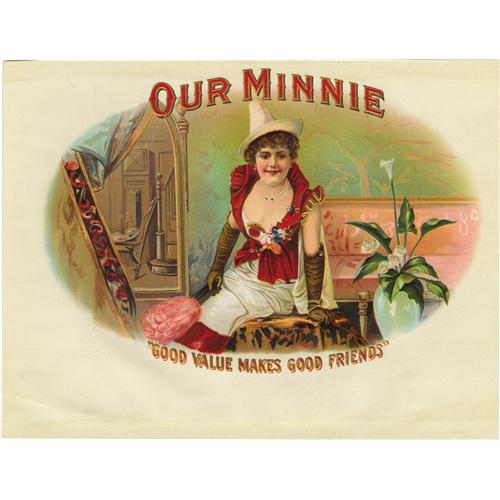 <B><I>Our Minnie</B></I></B></I><B> Cigar Label.</B></I> Full color lithographed 8.25" x 6.35" inner label with gold-embossed highlights. "Good Value Makes Good Friends" is the caption under this somewhat enigmatic illustration of an attractive female subject. Is she an artist's model, a prostitute, or a maid? A portrait painter's effects are clearly seen through a rear door, while "Minnie," clad in a revealing dress, holds a feather duster. Perhaps this label celebrates early multi-tasking. Excellent condition.<BR><BR><b>Shipping:</b> Small Flat (<a target="_blank" href="http://www.heritageauctions.com/common/shipping.php">view shipping information</a>)
