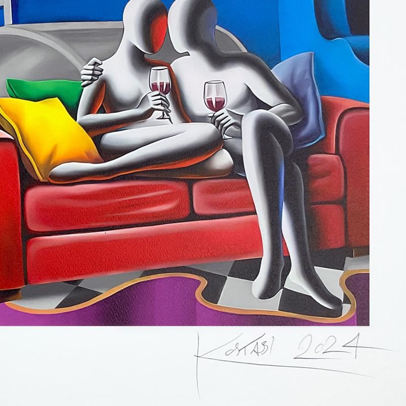 "Our Secret" is a limited edition serigraph on paper numbered and hand signed by Mark Kostabi. Includes Certificate of Authenticity. Measures approx. 21.5" x 35.5" (border) 13.5" x 28.5" (image).