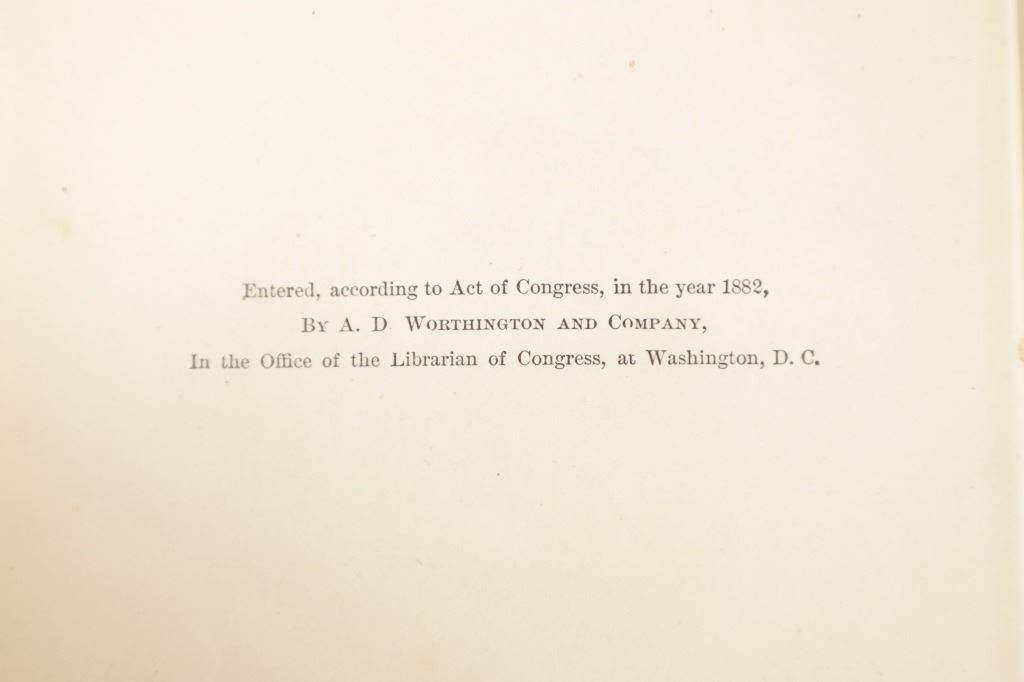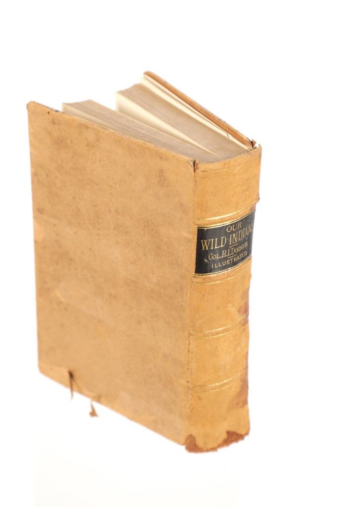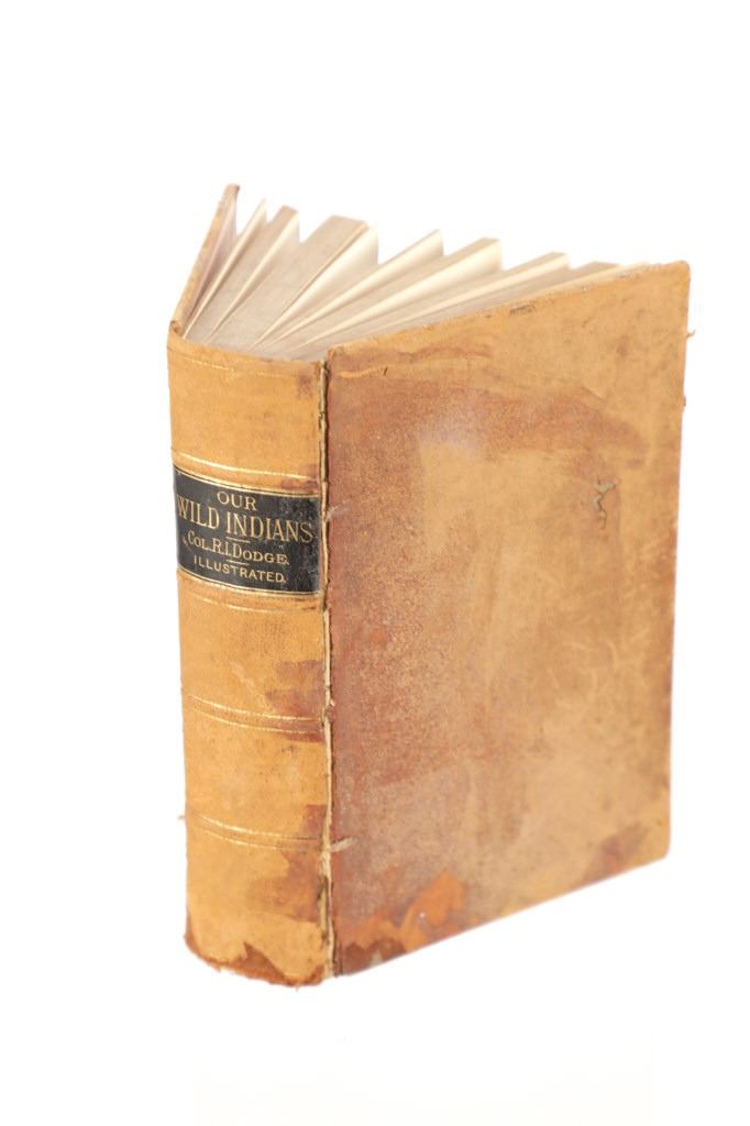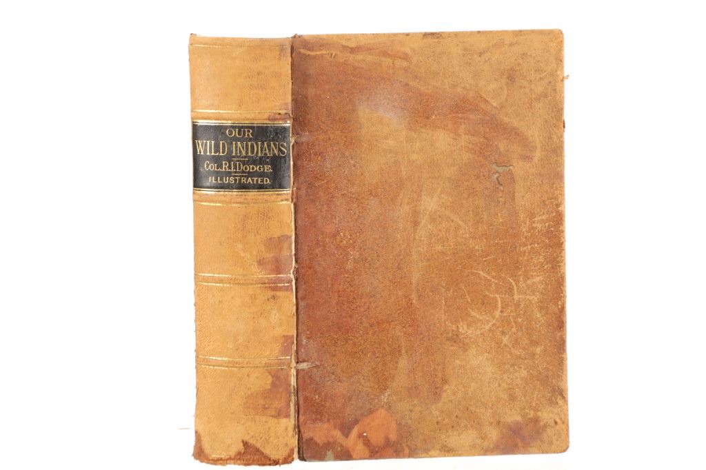 Presented in this lot is a Rare 1st Edition "Our Wild Indians: Thirty-Three Years' Personal Experience among the Red Men Of The Great West" by Colonel Richard Irving Dodge, United States Army, 1882, A. D. Worthington and Company Publishers, Hartford, Conn. A Popular Account of Their Social Life, Religion, Habits, Traits, Customs, Exploits, Etc. With Thrilling Adventures and Experiences On The Great Plains and In The Mountains Of Our Wide Frontier. Aide-de-camp to General Sherman. With An Introduction by General Sherman. Fully illustrated with portraits on steel, full page engravings on wood, and fine chromo-lithograph plates. Fascinating late 19th-century account of the lives and customs of Native American Indians written by Richard Dodge, a military aide to General Sherman who spent most of his career in the American West. This book is a broad discussion of practices and lifestyles of native American tribes including Apache, Sioux, Cheyenne, Arapahoe, Kiowa, and Comanche people. Includes mysterious Indian medicine and sacred rituals descriptions of Indian culture. Brown Leather bound gold gilt hardcover is in good overall condition, cover appears repaired, scuffing exhibited to cover and edges. Intact pages exhibit age tanning and slight foxing, no other obvious marring observed. Measures 9"L x 6.25"W x 2"D; 2 lbs .12 oz. weight approximate.*