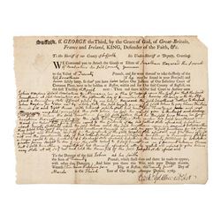 John Adams (1735-1826). Partly printed document acomplished in Adams's holograph manuscript and signed ("Adams") in corner on verso. B...