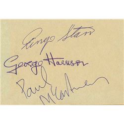 7x5 inch vintage autograph book page signed by Paul McCartney, George Harrison and Ringo Starr, missing John Lennon's autograph. Supplied with c...