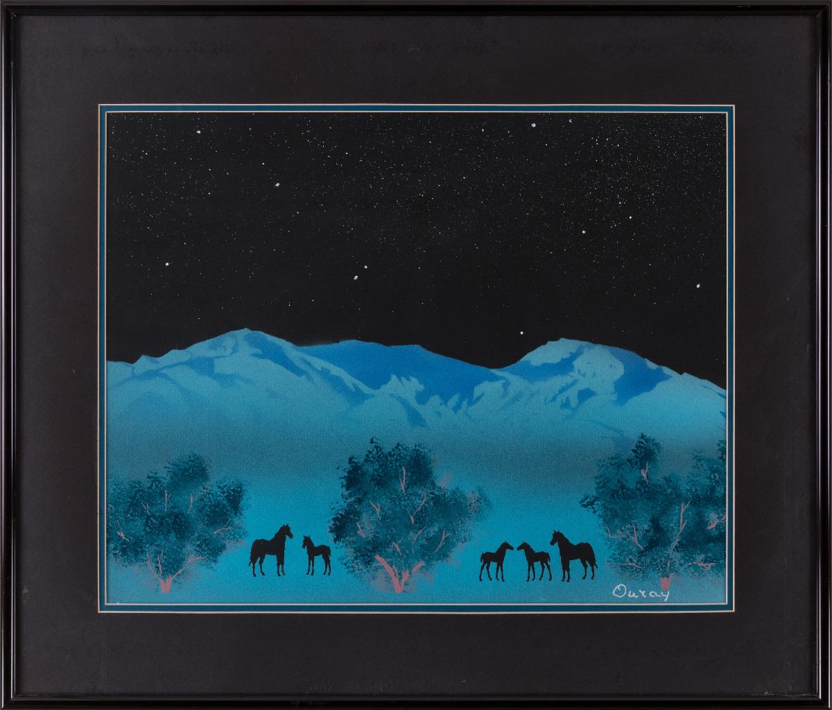 Ouray Meyers (1939 - ). Night Mountain. 14" x 18" mixed media. Signed lower right. Verso: "Especially for Charlene and Bill, my best to you!" Ouray. Short artist biography.