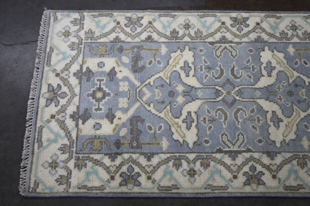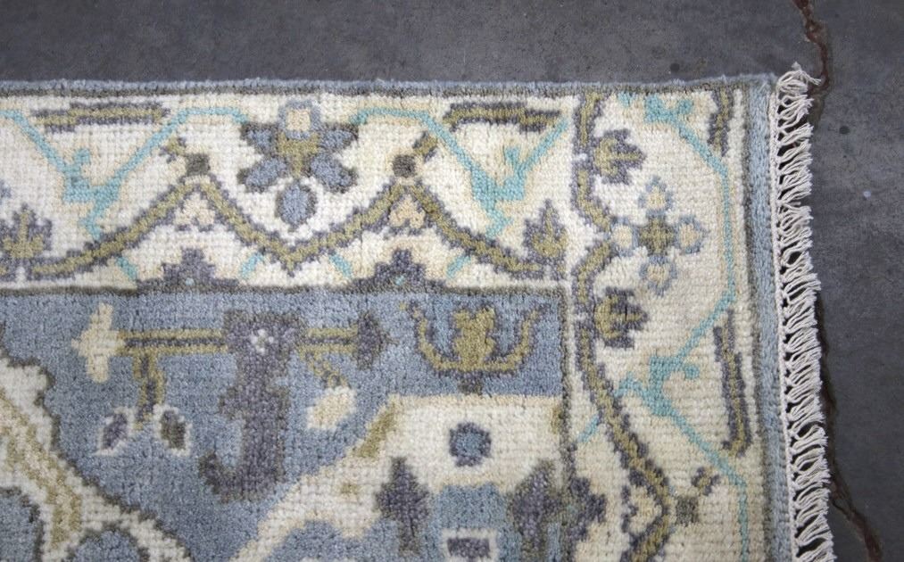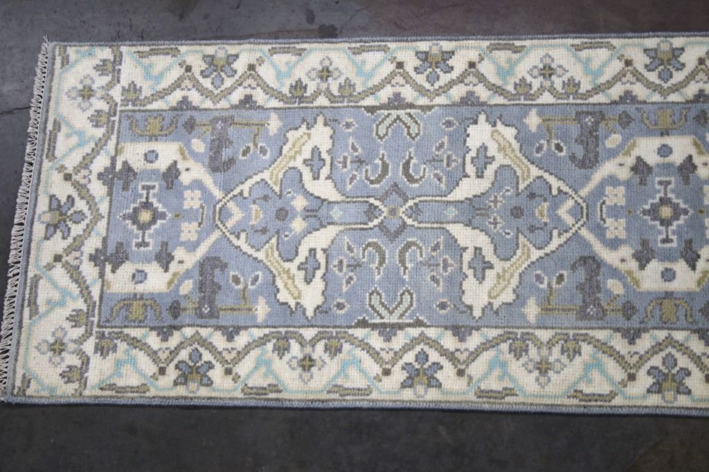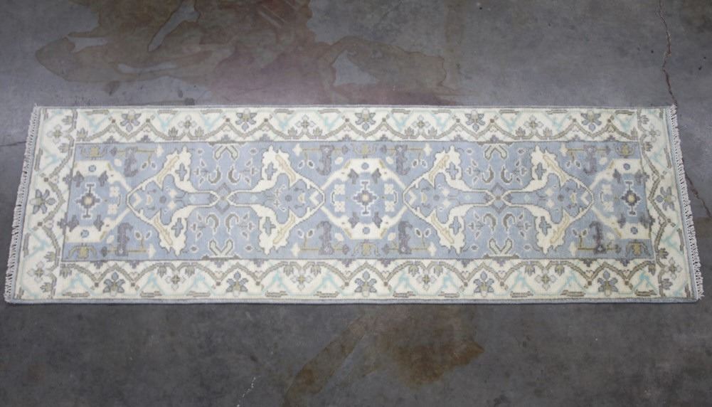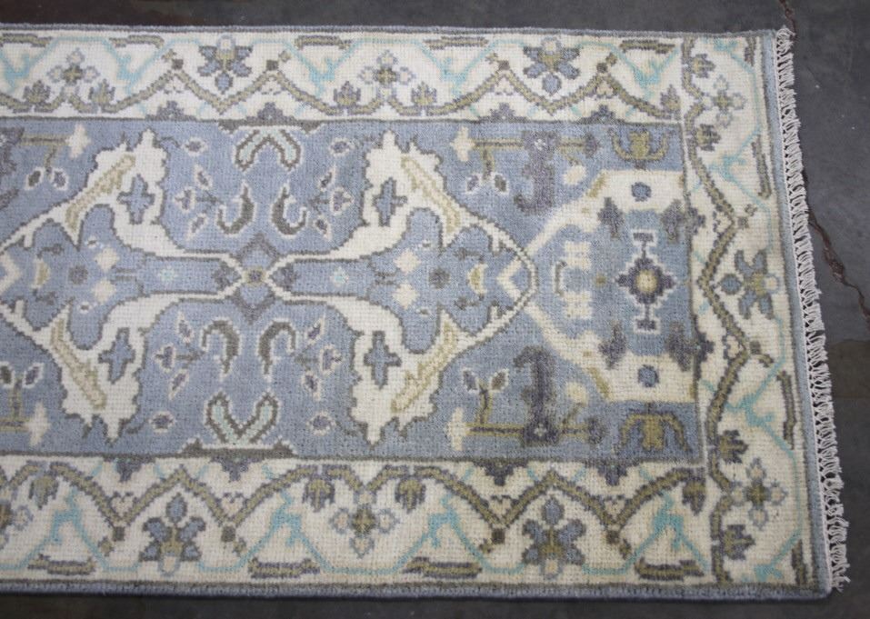Included in this lot is an Oushak Persian hand knotted wool runner rug originating from the 1930's. The rug features geometric floral patterns, light colors, and a tight weave. The Oushak rug is a style of Persian rug made in Oushak, located just south of Istanbul, Turkey. The Oushak rugs are known for their calm, muted colors and tame look. The rug displays geometric floral patterns with floral and vine like patterns across the border. The piece shows colors of white, yellow, grey, tan, teal, and light blue. The piece shows a wonderful, tight weave and fringe at each end. The rug is in good condition, with little wear and use. The rug measures 31" wide by 98" long.