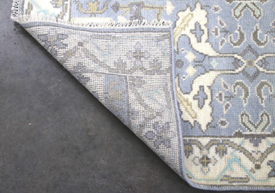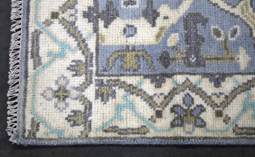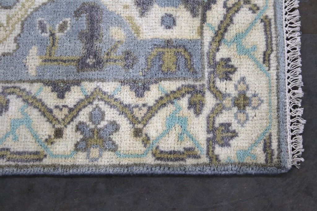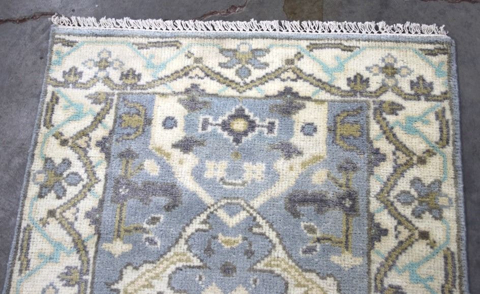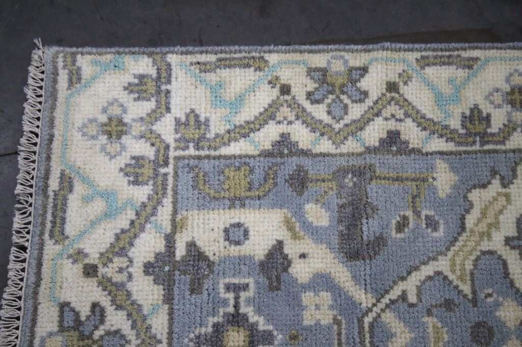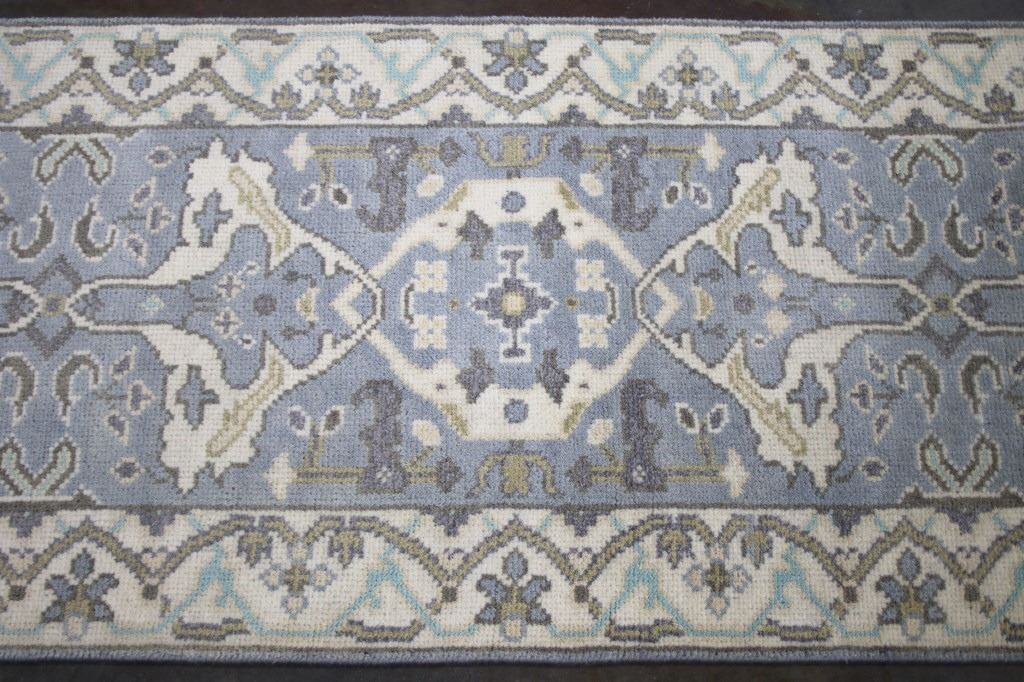 Included in this lot is an Oushak Persian hand knotted wool runner rug originating from the 1930's. The rug features geometric floral patterns, light colors, and a tight weave. The Oushak rug is a style of Persian rug made in Oushak, located just south of Istanbul, Turkey. The Oushak rugs are known for their calm, muted colors and tame look. The rug displays geometric floral patterns with floral and vine like patterns across the border. The piece shows colors of white, yellow, grey, tan, teal, and light blue. The piece shows a wonderful, tight weave and fringe at each end. The rug is in good condition, with little wear and use. The rug measures 31" wide by 98" long.