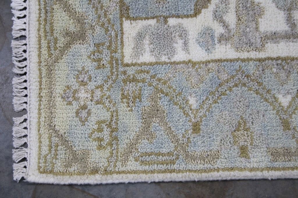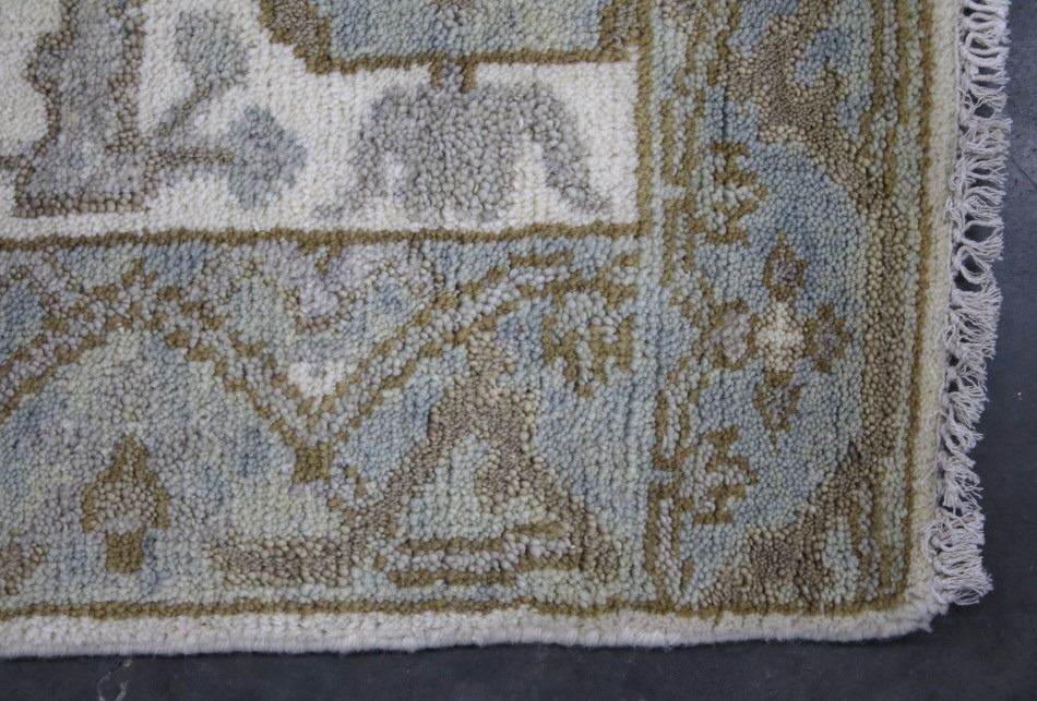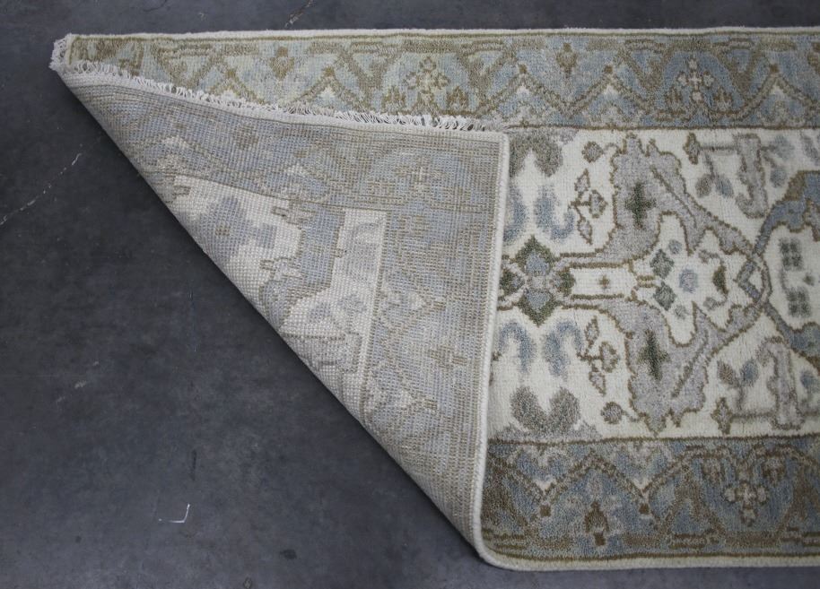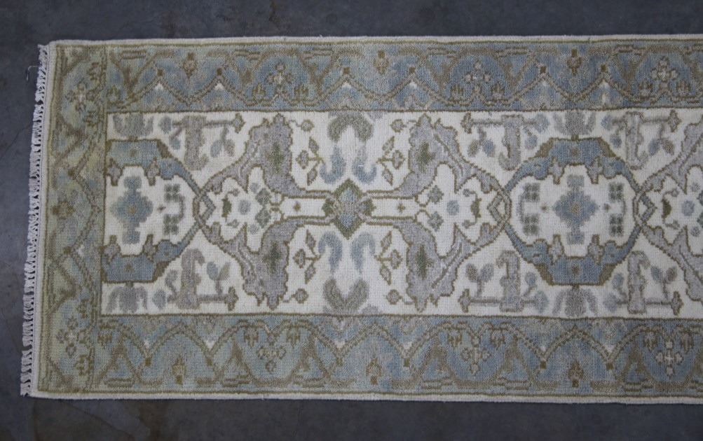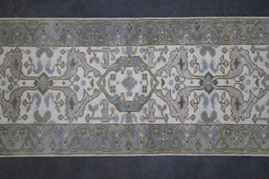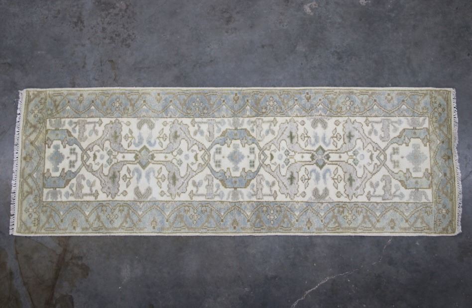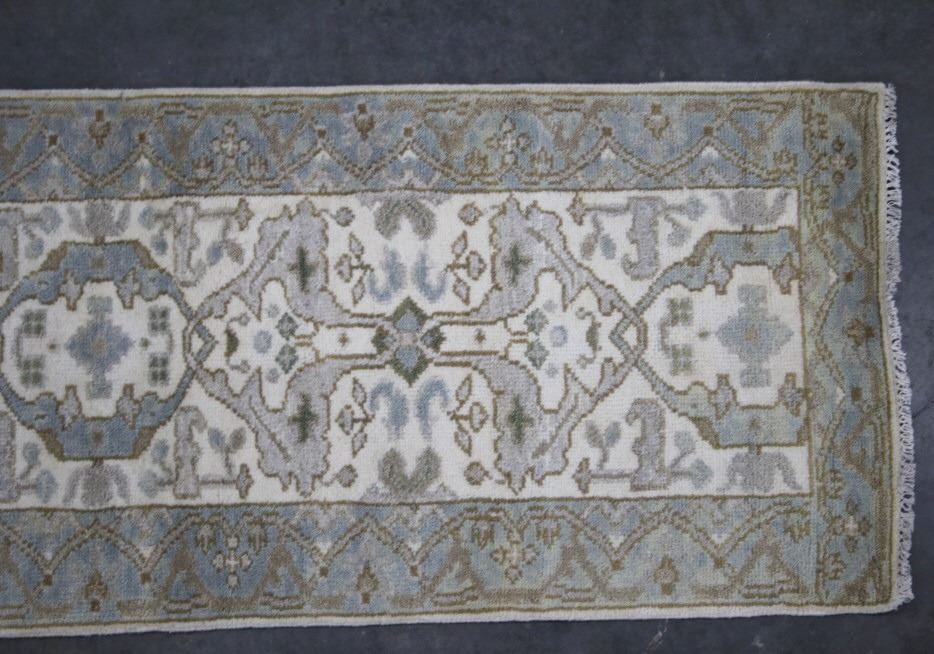 Included in this lot is an Oushak Persian hand knotted wool runner rug originating from the 1930's. The rug features geometric floral patterns, light colors, and a tight weave. The Oushak rug is a style of Persian rug made in Oushak, located just south of Istanbul, Turkey. The Oushak rugs are known for their calm, muted colors and tame look. The rug displays geometric floral patterns with floral and vine like patterns across the border. The piece shows colors of white, yellow, grey, light blue, and green. The piece shows a wonderful, tight weave and fringe at each end. The rug is in good condition, with little wear and use. The rug measures 33" wide by 96" long.