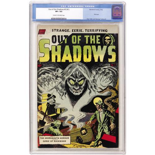 <B>Out Of The Shadows #5 (#1) (Standard, 1952) CGC VF+ 8.5 Cream to off-white pages.</B></I> This was the first issue of the title, issue numbering notwithstanding! George Roussos provided the cover; Alex Toth, Ruben Moreira, and George Tuska did some of the interior artwork. Overstreet 2006 VF 8.0 value = $340; VF/NM 9.0 value = $533. CGC census 3/07: 3 in 8.5, 3 higher.<BR><BR><b>Shipping:</b> Comics - Slabbed (certified) (<a target=""_blank"" href=""http://www.heritageauctions.com/common/shipping.php"">view shipping information</a>)