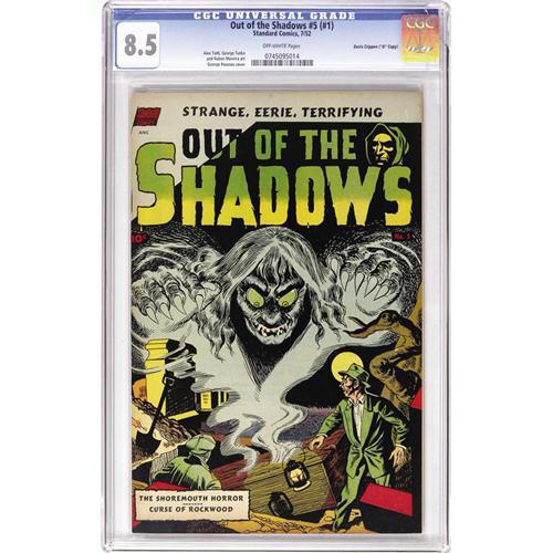 <B>Out Of The Shadows #5 (#1) Davis Crippen ("D" Copy) pedigree (Standard, 1952) CGC VF+ 8.5 Off-white pages.</B></I> The first issue of this title featured some well-known artists; namely Alex Toth, Ruben Moreira, George Tuska, and George Roussos, the latter providing the cover art. Overstreet 2006 VF 8.0 value = $340; VF/NM 9.0 value = $533. CGC census 7/06: 2 in 8.5, 3 higher. <I>From the Crippen Collection</B></I>. <BR><BR><B>Important notice:</B> Heritage usually auctions material at the rate of 200-250 lots per hour. On some occasions eBay Live bid software or the Internet may not be able to keep up with the pace of the auction. We recommend placing a realistic absentee bid now as insurance to avoid disappointment. Occasionally the auctioneer may eliminate or reject an eBay Live bid, and the auctioneer may also reopen a lot after the close of the eBay live bidding (usually because we missed an audience bid), and may reject your bid even if it shows you as the winning bidder. By bidding via eBay Live, you agree that Heritage may award the lot to another bidder at its sole discretion under the circumstances described above or any other reasonable circumstances. Since eBay bids are not shown to us until we open the lot on the floor, we treat those bids just like floor bids. In most cases the floor responds before the eBay bid is presented to us, due to Internet lag time, so for consistency we have made it a policy that floor bids are always considered first over tie eBay live bids. Also please note that all Heritage lots purchased through eBay Live carry a 22.5% Buyer's Premium. Please make sure you read the Terms and Conditions before you bid. This lot is being auctioned in conjunction with a live floor auction by Heritage Auction Galleries. All final auction and invoice information will be supplied by Heritage Auction Galleries, and all other information should be considered preliminary. Lot:41001 <BR><BR><B>Winning Notification and Billing:</B> After the FINAL session in this auction is complete, Heritage will send e-mail and snail mail invoices. This process normally takes several days. All final auction and invoice information will be supplied by Heritage Auction Galleries, and all other information should be considered preliminary. <BR><BR>This auction will be conducted on a live auction floor and over the Internet through eBay Live. If you choose to place an absentee bid, please take a moment to <font color='#0000ff'><u><a href='http://pages.ebay.com/liveauctions/help/before/laabsentee.html'>learn how eBay Live absentee bidding works</a></u></font><font color='#000000'>