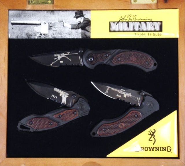 Tribute knife collection; including the M3, 1911 and BAR lock blade pocket knives. All are mint and with original shipping boxes.