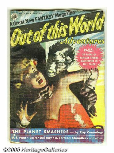 <B>Out of This World #1 (Pulp) (Avon, 1950) Condition: VG.</B></I> An interesting comic/pulp hybrid; it contains "32 pages of fantasy stories illustrated in full color." The stories included are "Crom the Barbarian" by Gardner Fox and drawn by John Guinta, and two stories illustrated by Joe Kubert -- just like Avon's <B>Out of This World</B></I> #1 comic book. Hmm, maybe there's a connection.... <B>The Ultimate Guide to the Pulps</B></I> VG value = $50. <I>From the Collection of Chris Bell</B></I>.