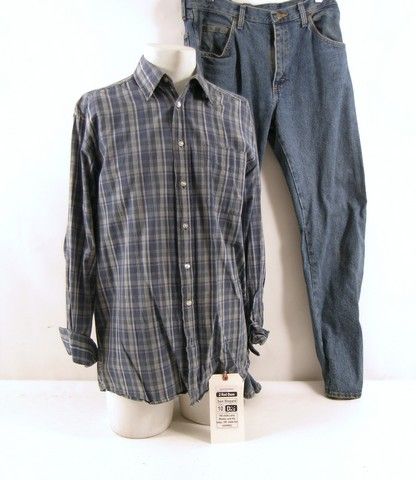 Out of the Furnace - Gerald 'Red' Baze (Sam Shepard) screen worn, hero, two tone blue plaid long sleeve button front 'Hathaway' shirt, (size M) and dark blue denim 'Wranglers' jeans. (size 34) Includes wardrobe tag!