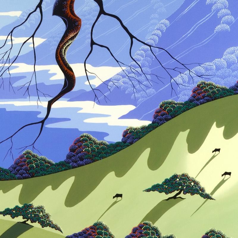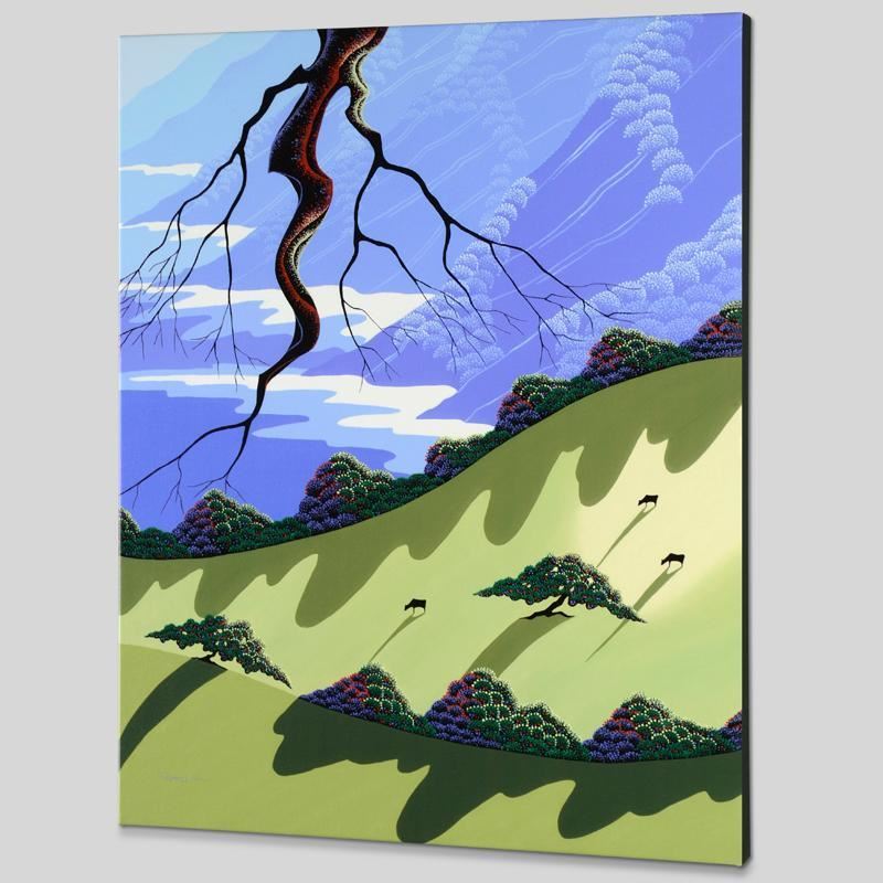 Larissa Holt, a student of distinguished artist Eyvind Earle (1916-2000), uses bold colors and breathtaking scenery to create images of Nature in her own unique style. "Out to Pasture" is a limited edition giclee on stretched canvas by Holt, numbered and bearing Holt's authorized signature. This piece comes gallery wrapped. Includes Certificate of Authenticity! Measures approx. 21.5" x 27" x 1.5" (image).