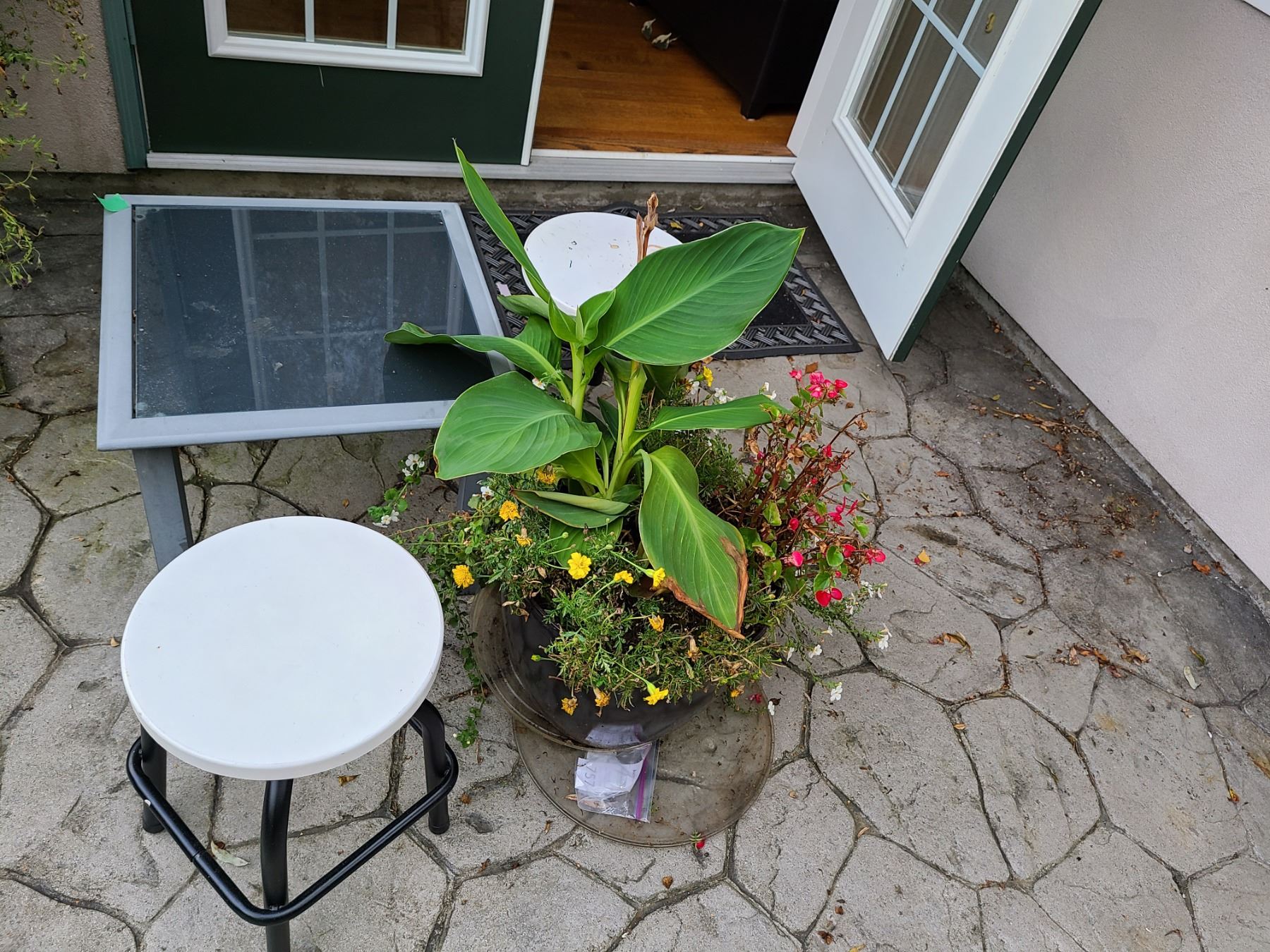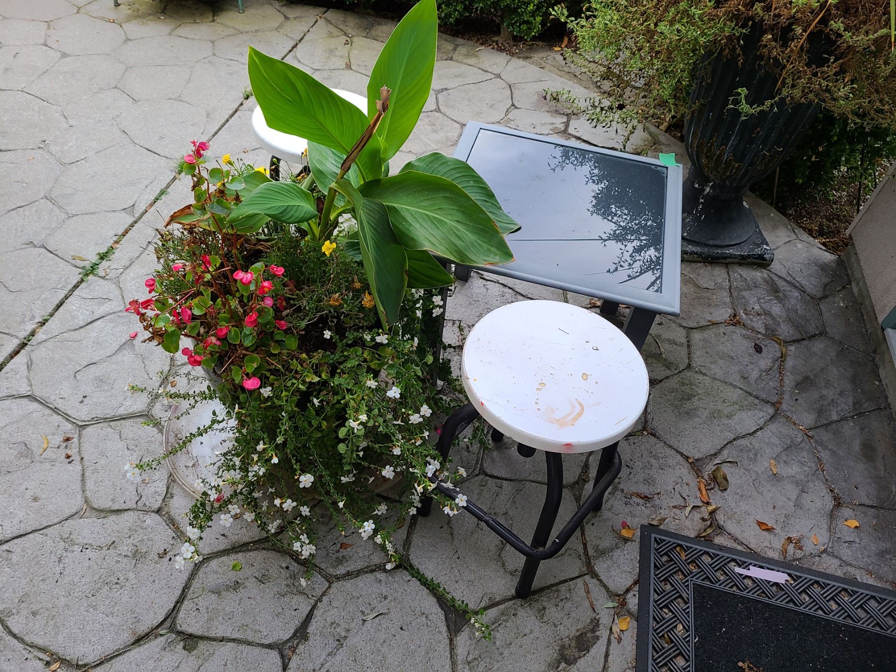 Small glass top table, planter, 2 stools. Pickup at 11 am