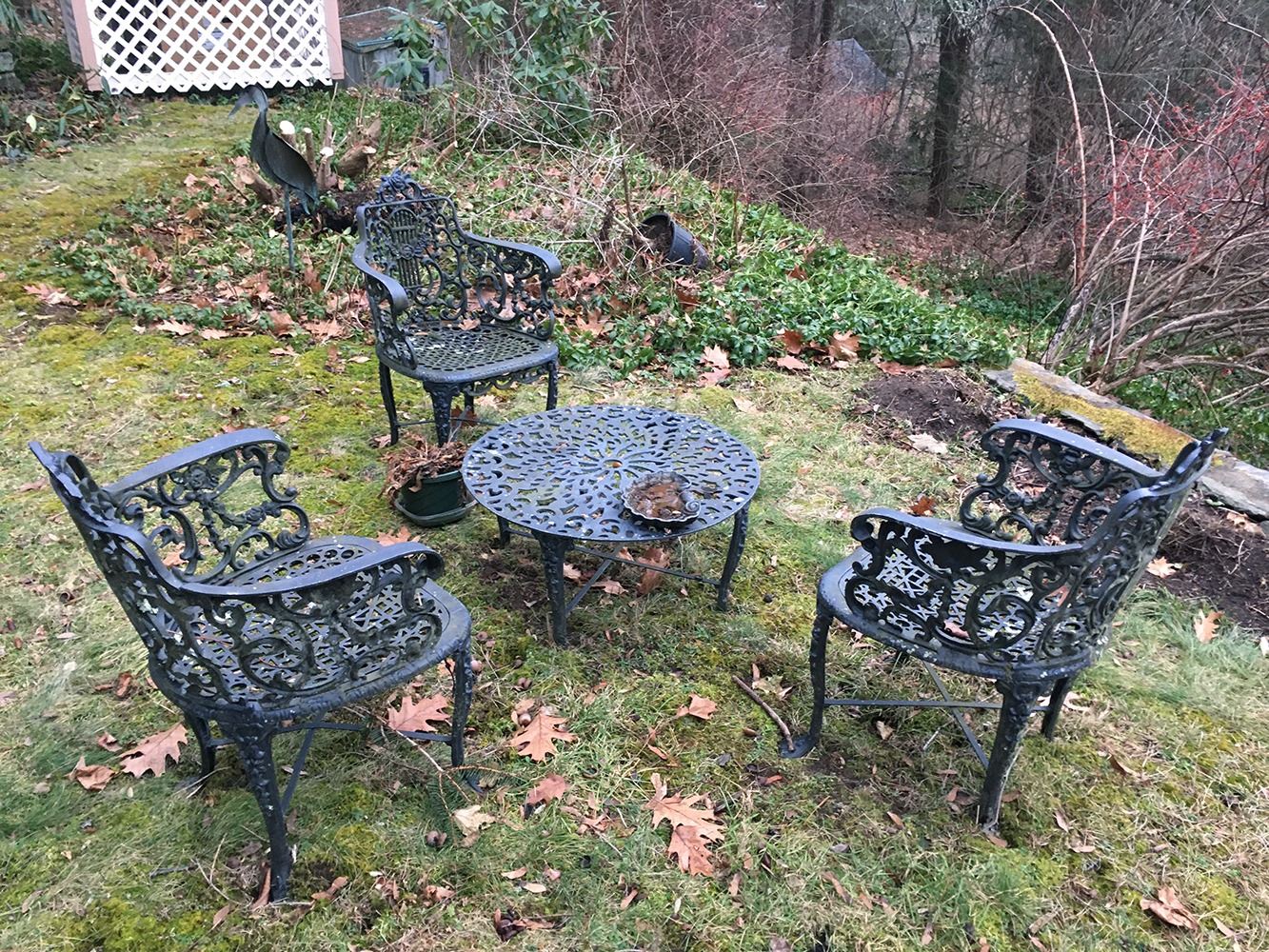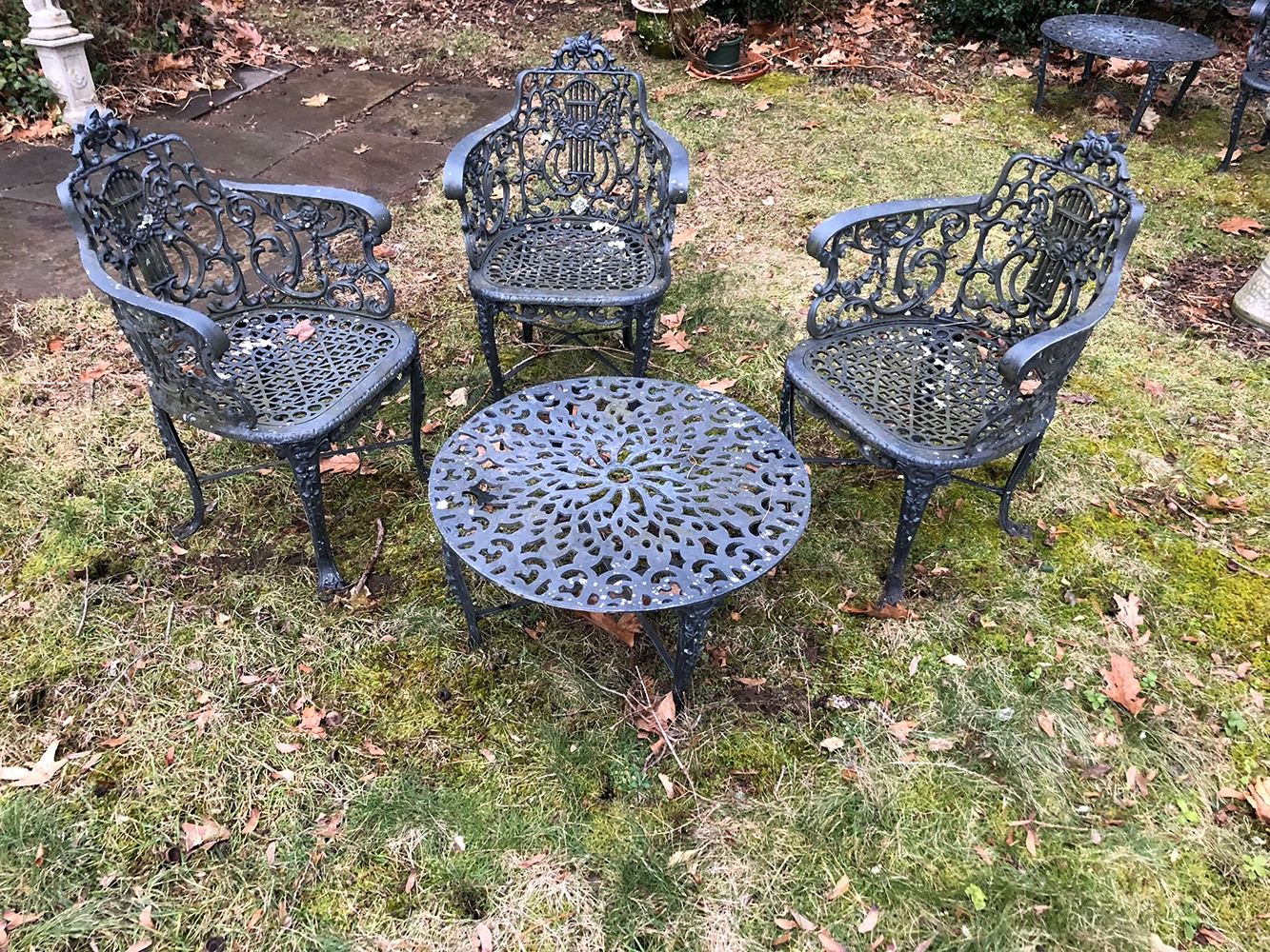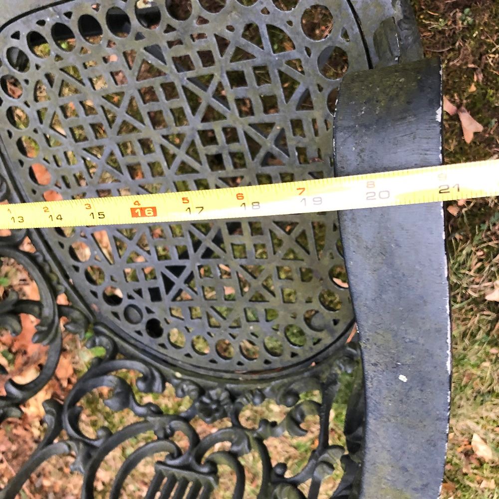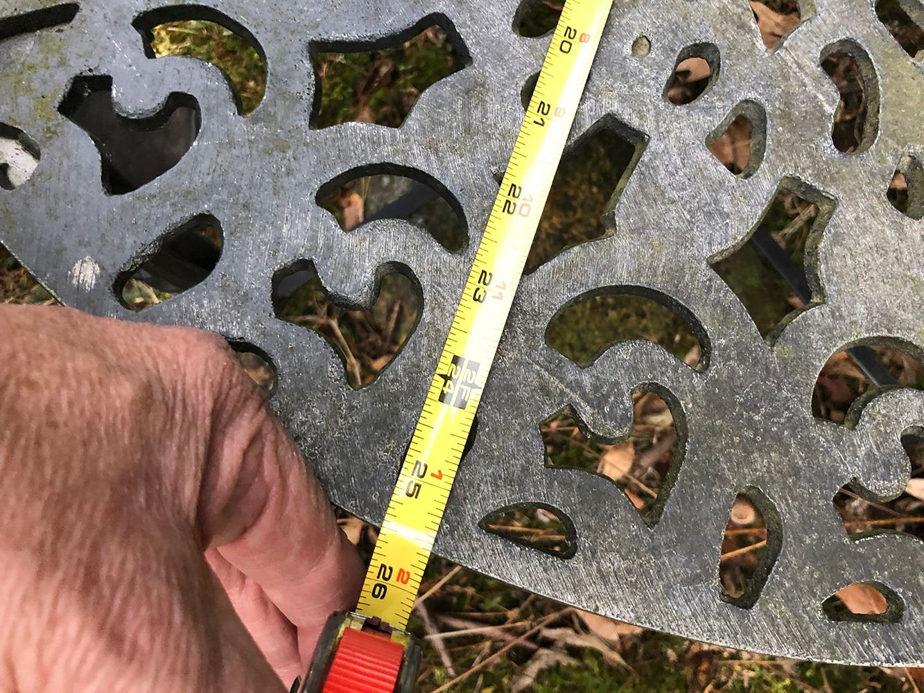 Outdoor Garden Set includes table and 3 arm chairs. Table measures approx. 25.5 inches wide, chairs measure approx. 21 inches wide. pd