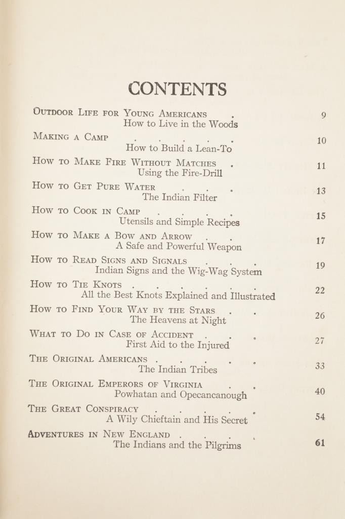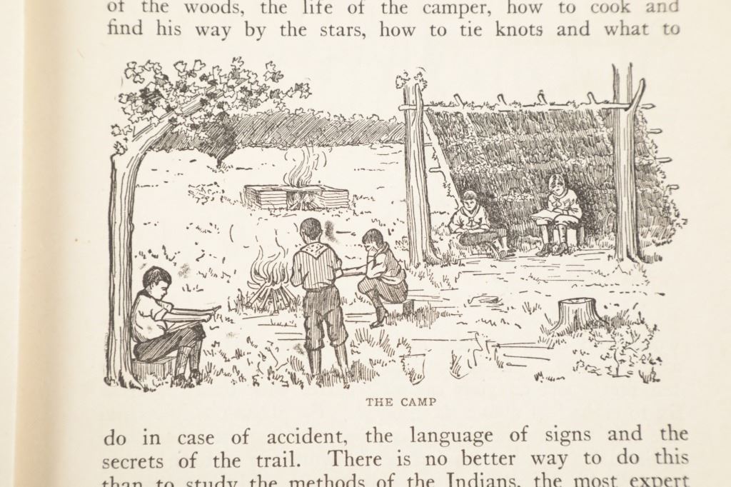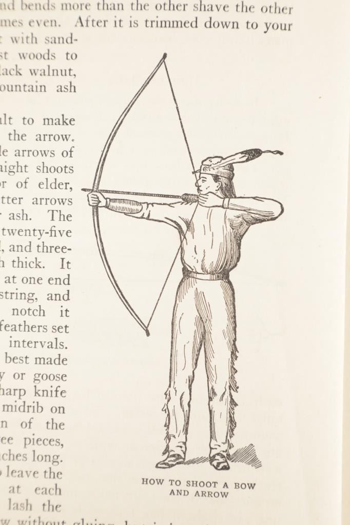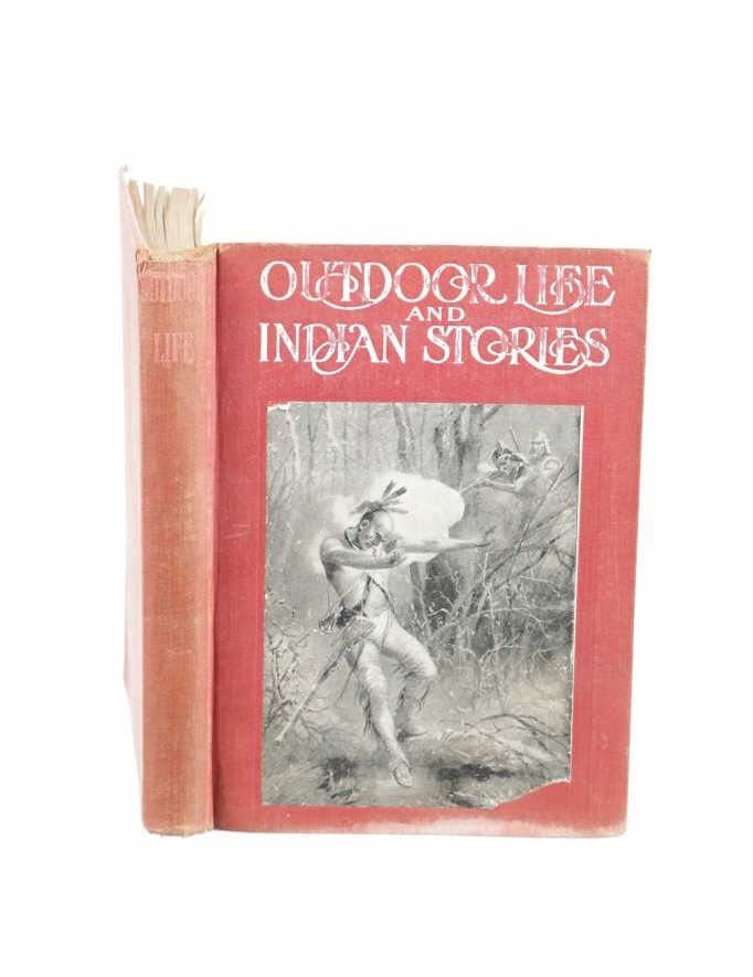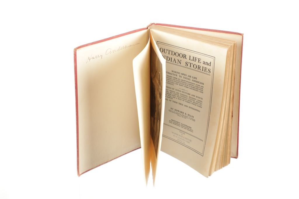 Included in this lot is a First Edition of "Outdoor Life and Indian Stories" by, Edward S. Ellis, 1912, Wilmore Book & Bible Co., Chicago, Ill. publisher. A collection of essays and anecdotes, offering basic instructions to making a camp, get pure water, making a bow and arrow, how to read signs and signals, what to do in case of an accident, all drawing on the practices of Native Americans. These chapters are followed by chapters giving the history of Native Americans, including Powhatan, Pontiac, Red Jacket, Little Turtle, Sitting Bull and others. Edward S. Ellis (1840-1916), was a prolific American author of hundreds of books and magazine articles perhaps best known internationally for his "Deerfoot" novels read widely by young boys until the 1950s. The red cloth bound stamped illustration hardcover is in fair condition, spine loose at board seams, scuffing and fading observed on covers and spine. Intact pages exhibit age tanning and slight foxing, fore edge staining noted on rear pages, page 129 torn. Measures 6.75"W x 9.5"L x .75"D, weight is 1lb, 2oz.
