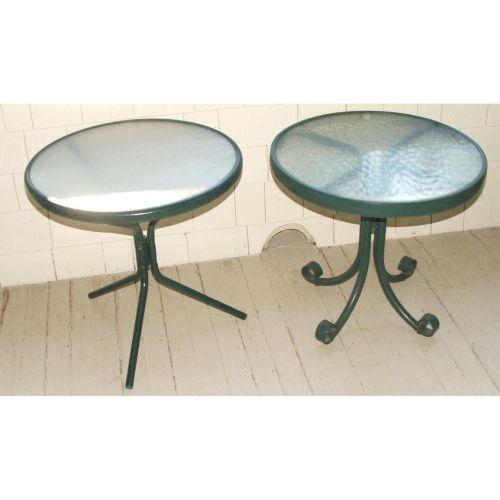 Set of two outdoor tables with glass tops and green painted metal bases.
