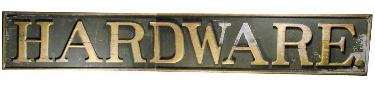 Outdoor Wood Sign for a Hardware Store. Letters are applied and parts of some of them are missing. Otherwise good condition. 97 X 16 inches.