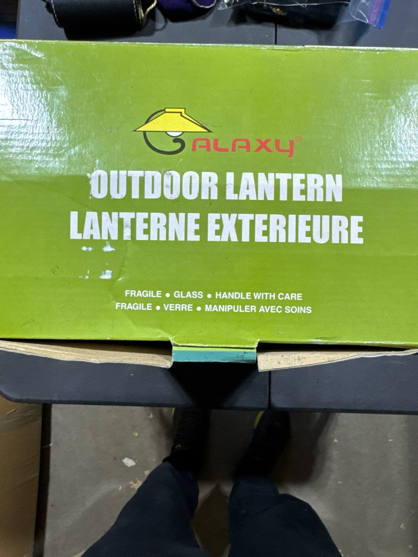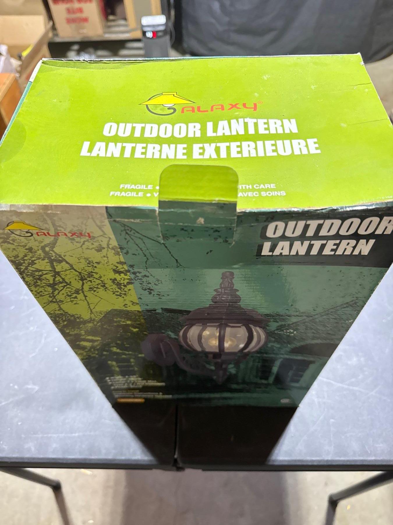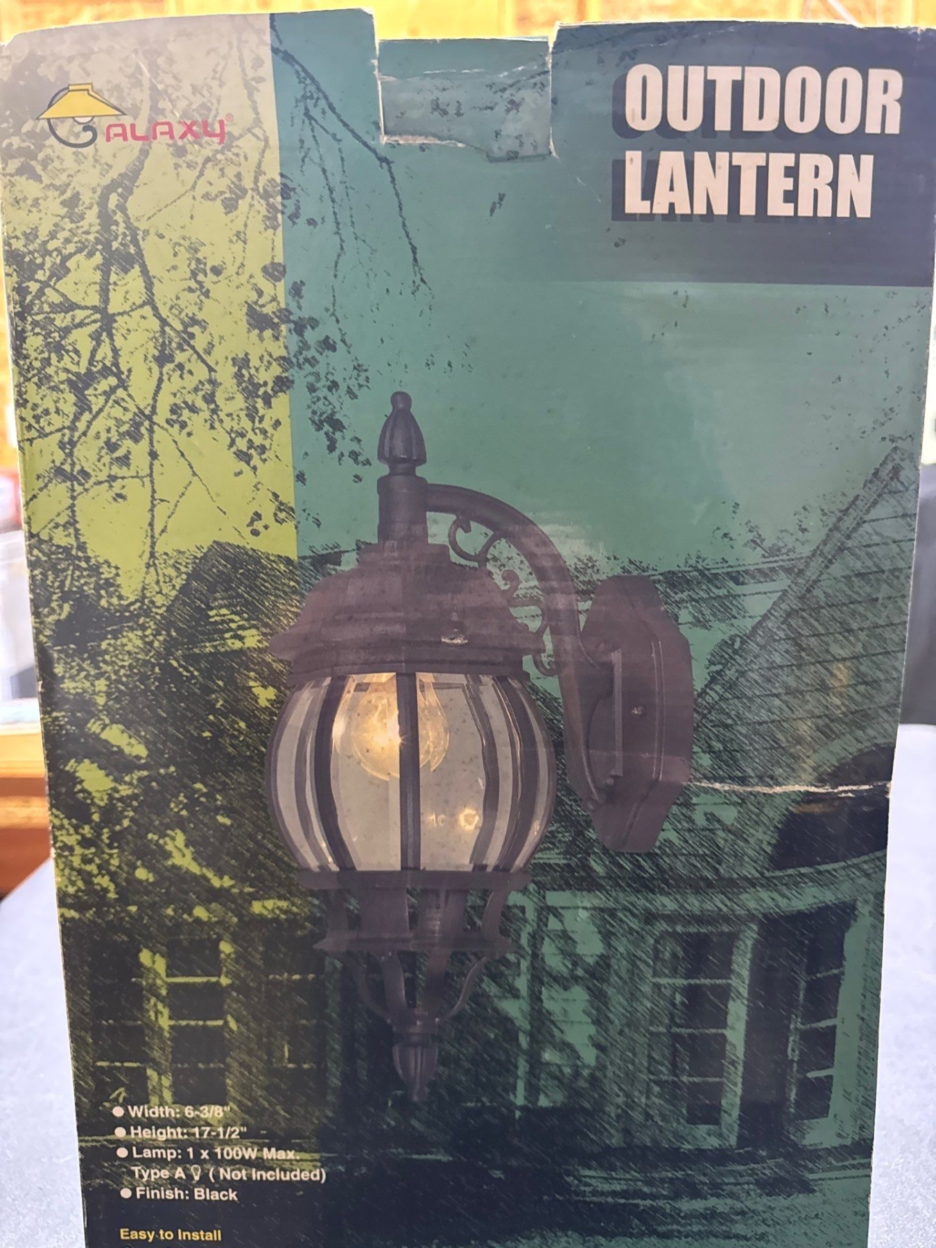 Outdoor lantern. Width, six dash three eighths of an inch. Height, 17 dash half inch. Lamp, one by 100 watt max. Type a. Finish, black. Easy to install. Complete instructions. Mounting hardware included. Brand new inbox.