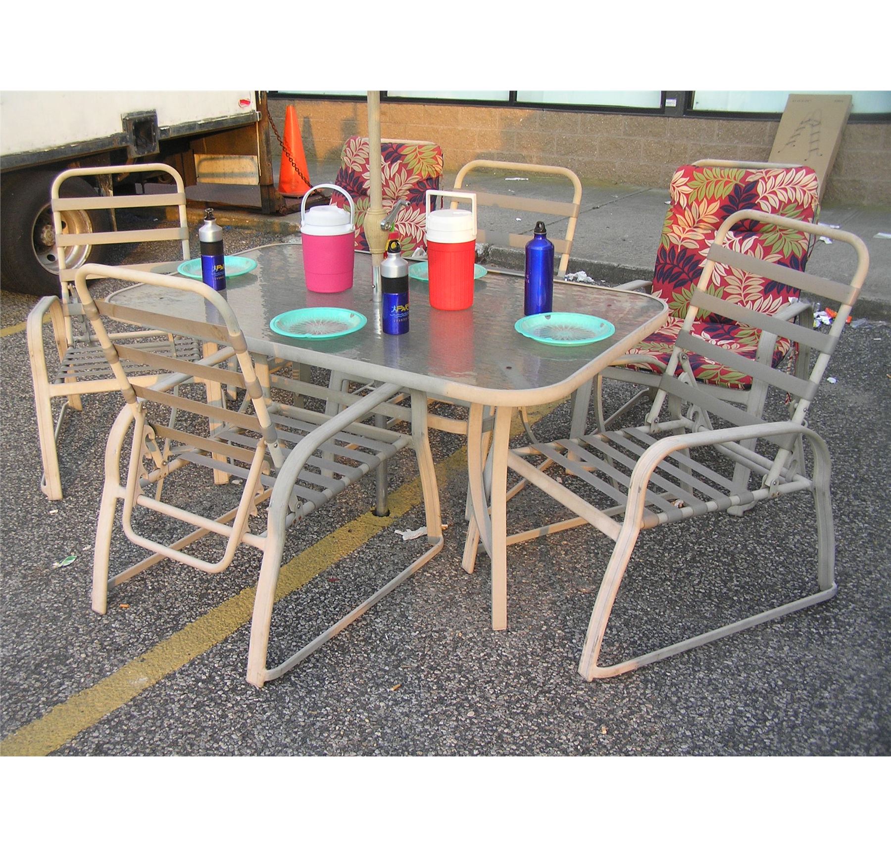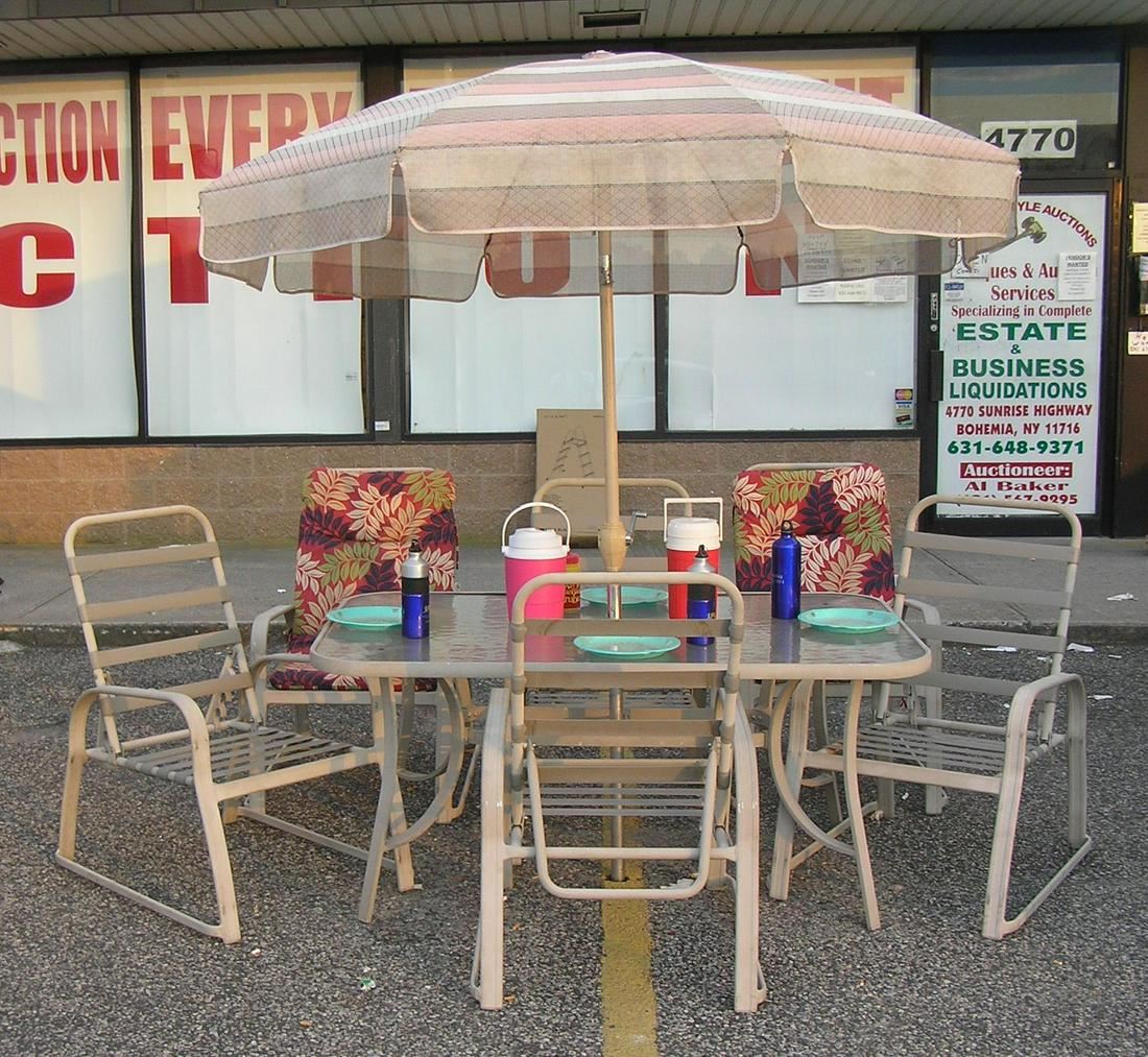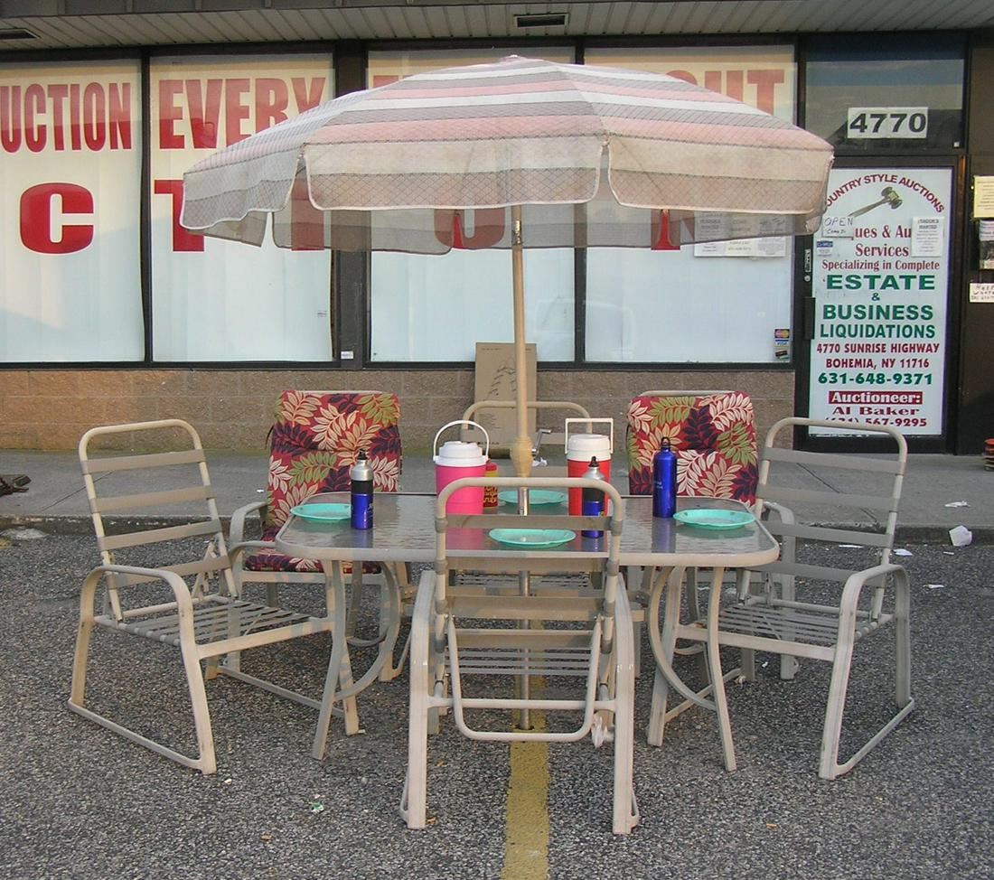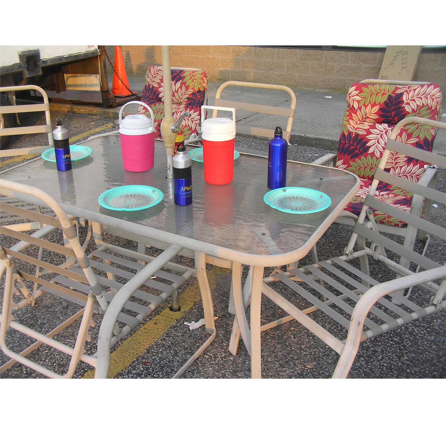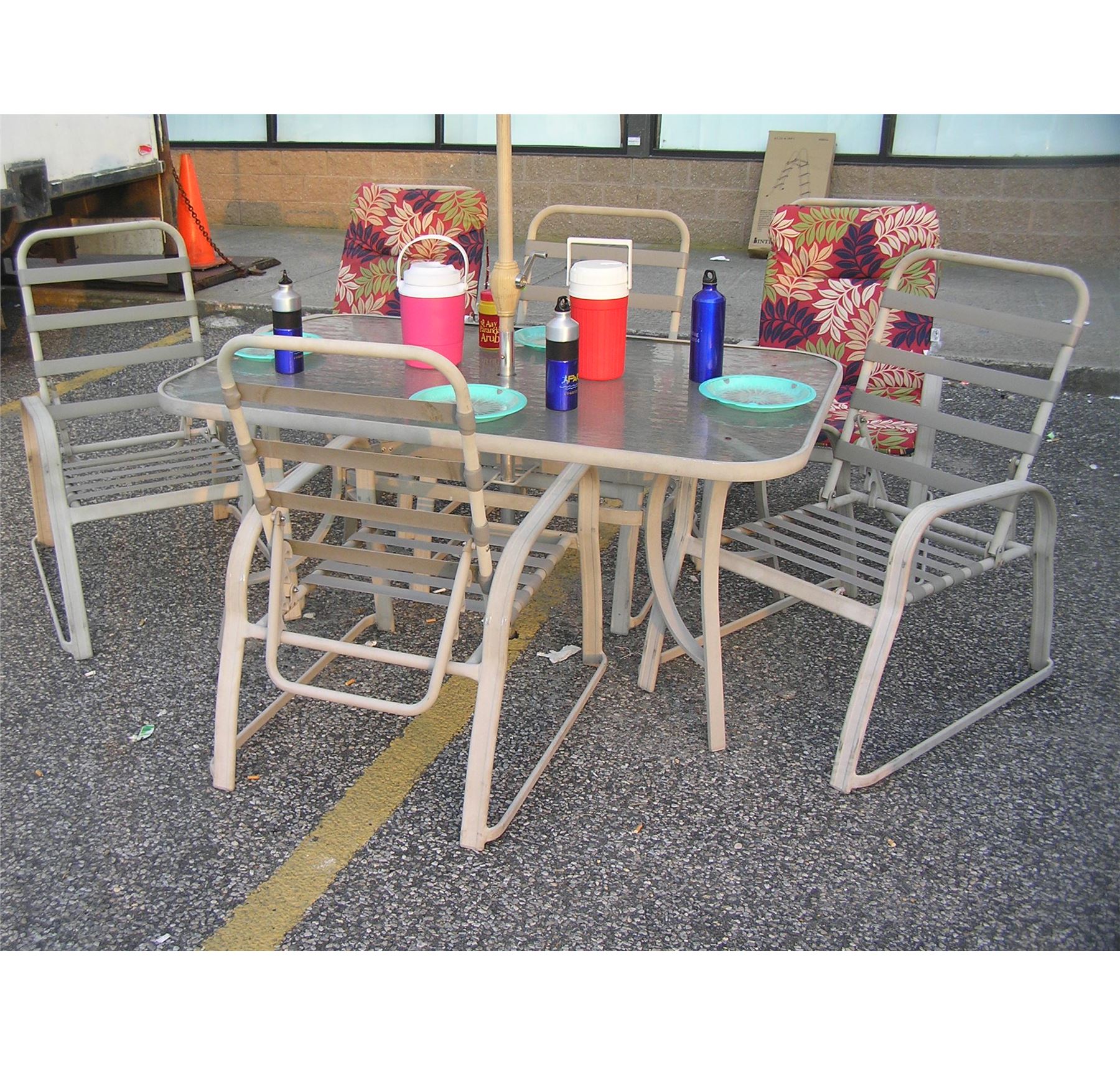 8 piece cast aluminum outdoor table, chair and umbrella entertainment set with completely foldable and stackable chairs for easy storage, part of a moving and storage Co.seized merchandise liquidation cost new: $950.00
