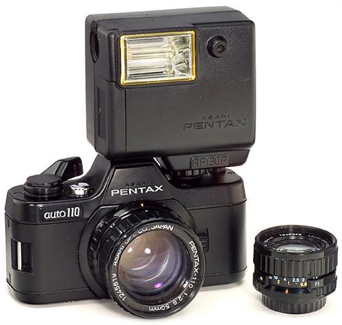 Outfit "Pentax auto 110" Asahi Pentax, Japan. SLR for film 110, with interchangeable lenses "Pentax-110 2,8/50", with close-up lens, lens hood, 2 caps, "Pentax-110 2,8/18", with close-up lens, lens hood, 2 caps, "Pentax-110 2,8/18", with light filter, 2 caps, Pentax flash unit AF130P, large outfit case.<Br>