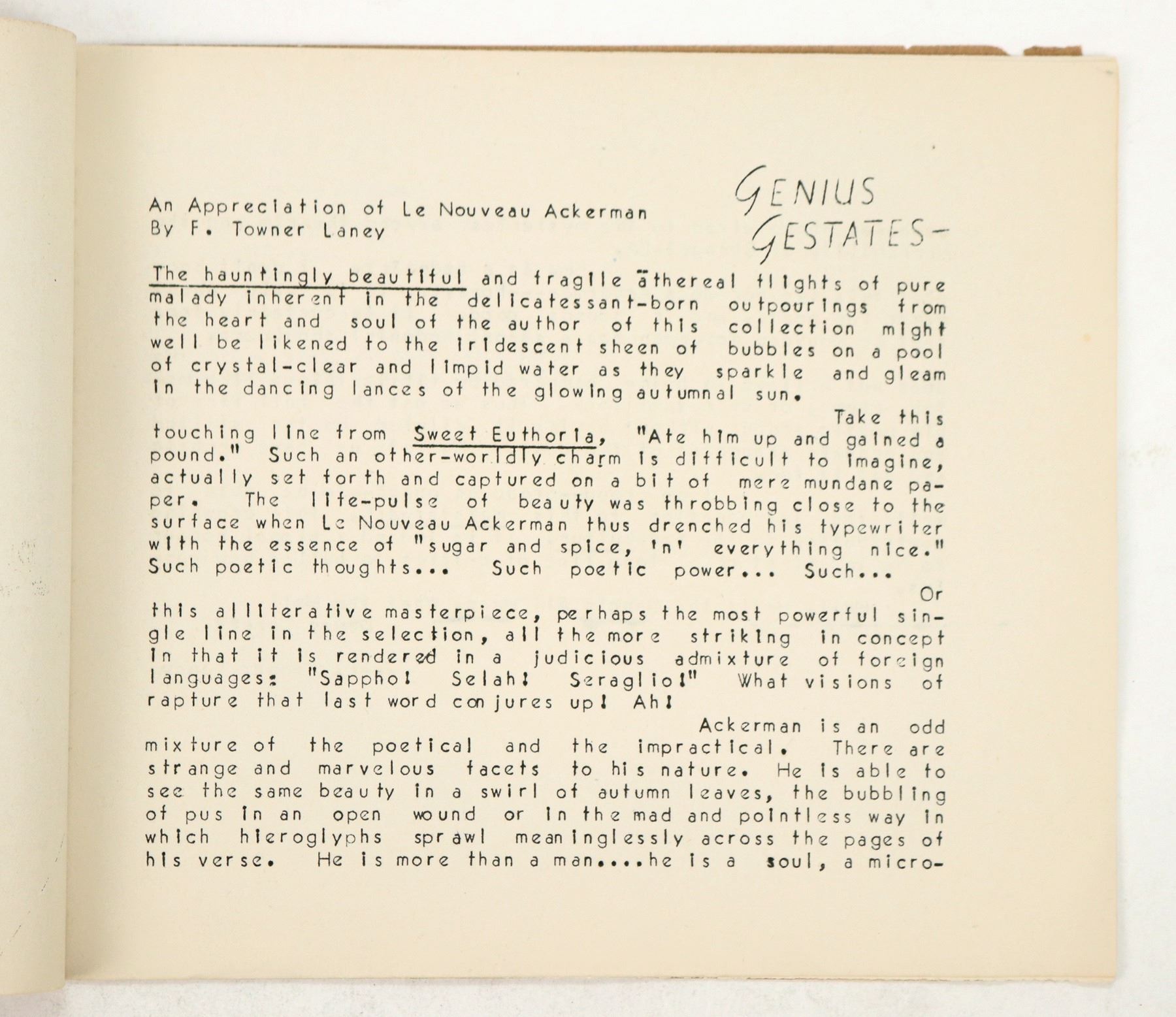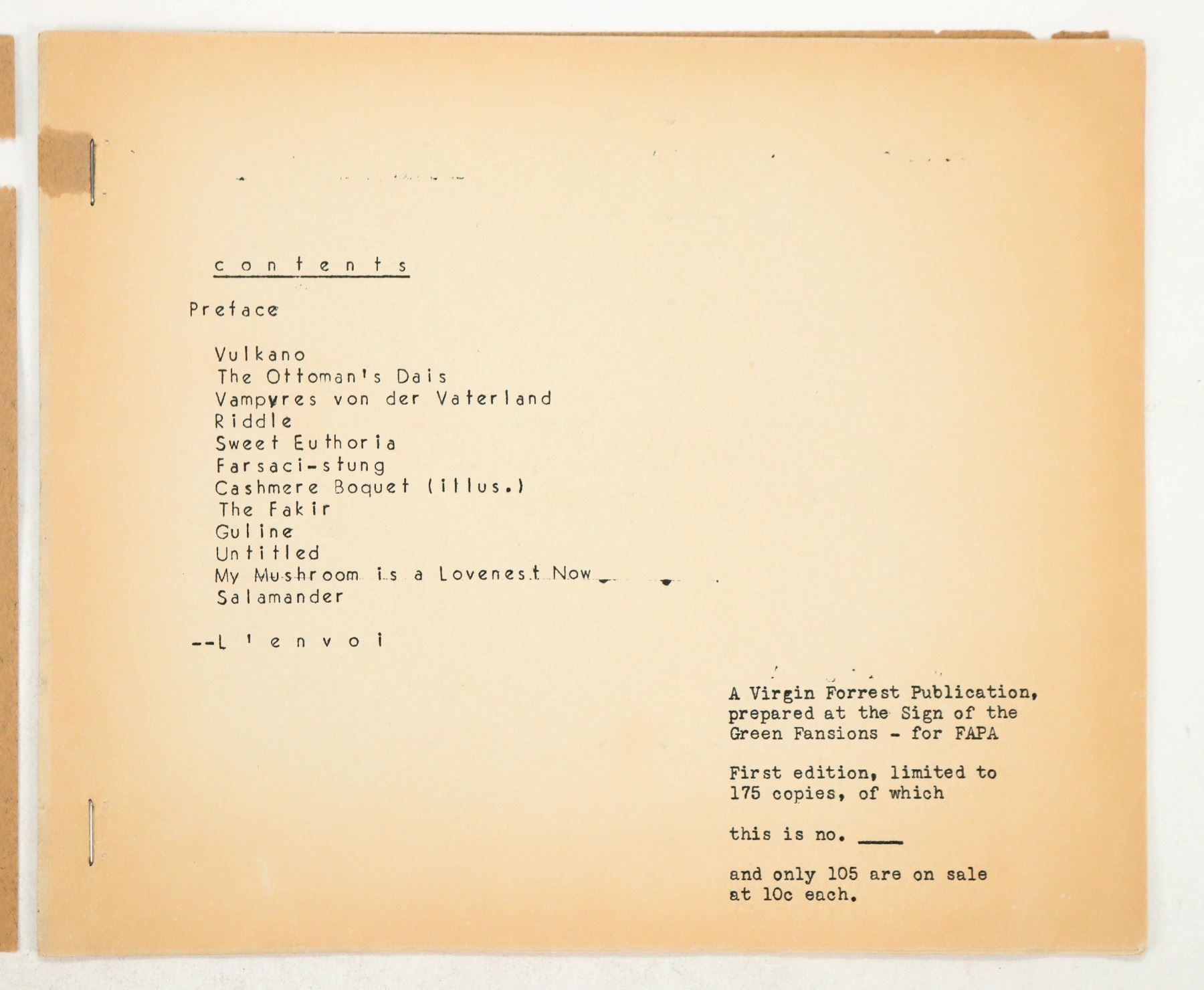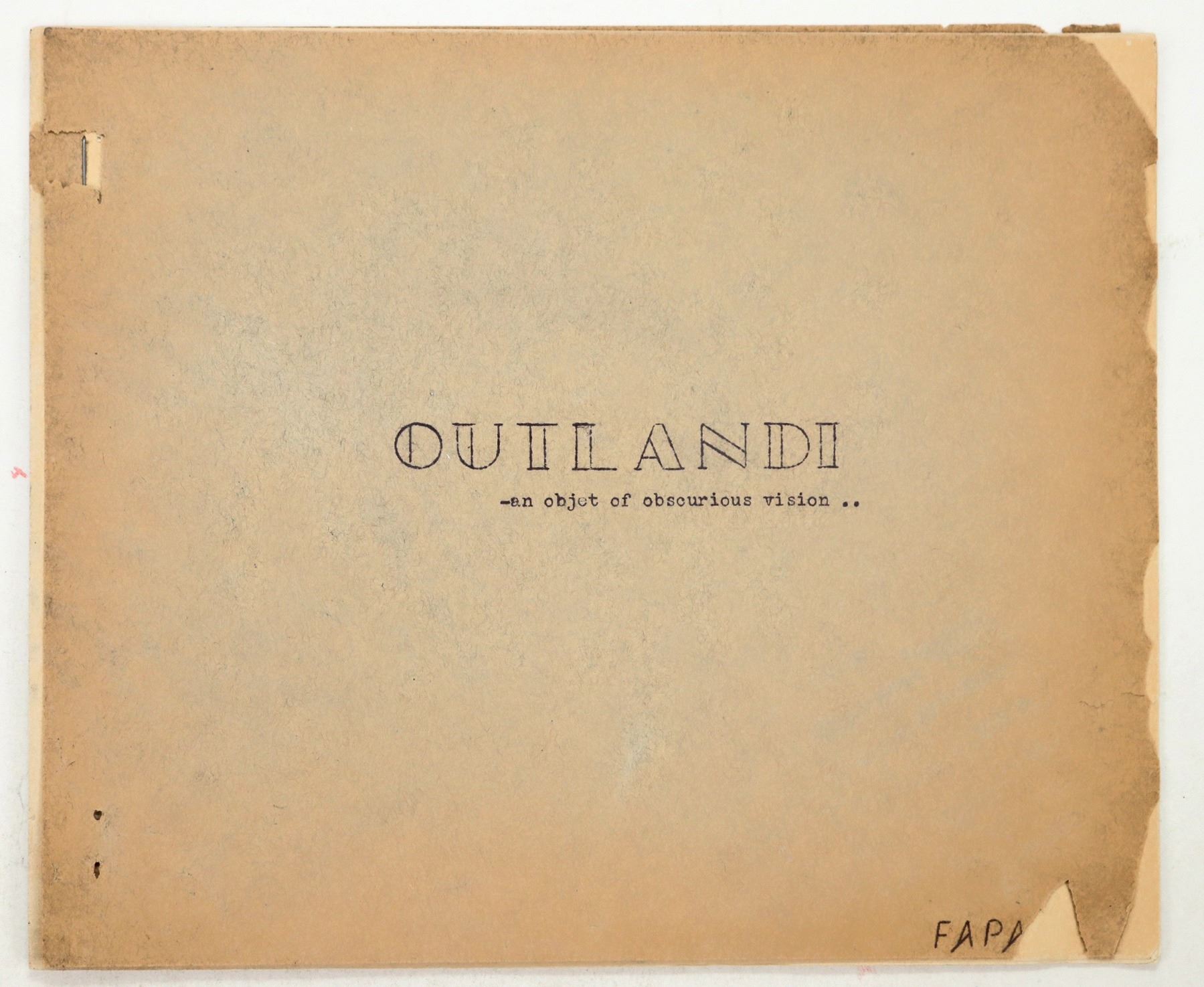 First edition of a poetry collection limited to 175 copies: "Outlandi - an object of obscurious vision.." by Forrest J. Ackerman. Twelve poems in a 8 x 7 inch paper folio. Cover detached, typewritten. Ackerman was an expert on science fiction, horror and fantasy films, a science fiction writer and literary agent._x005F_x000D_