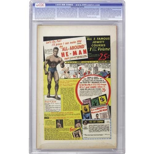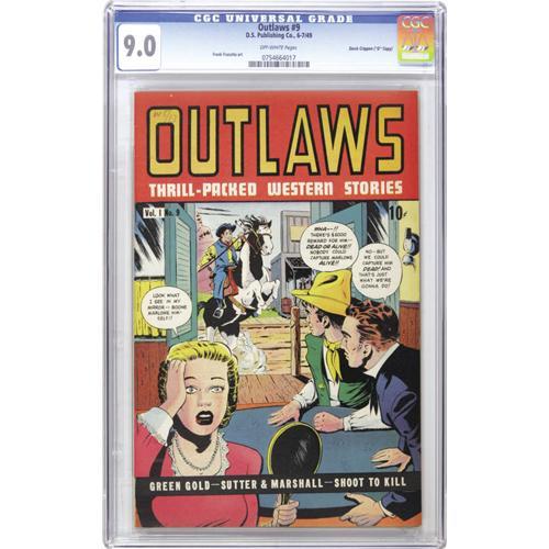 <B>Outlaws #9 Davis Crippen ("D" Copy) pedigree (D.S. Publishing, 1949) CGC VF/NM 9.0 Off-white pages.</B></I> Frank Frazetta art pops up in the darnedest places -- this is the only issue of the title that Frazetta contributed to, and the book is called "scarce" by Overstreet. And this is the only copy graded above FN/VF 7.0 by CGC to date. Overstreet 2006 VF/NM 9.0 value = $441; NM- 9.2 value = $600. CGC census 9/06: 1 in 9.0, none higher. <I>From the Crippen Collection</B></I>.<BR><BR><b>Shipping:</b> Slabbed Comic (<a target="_blank" href="http://www.heritageauctions.com/common/shipping.php">view shipping information</a>)