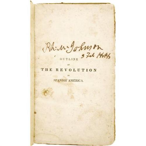 <B> Manuel Palacio Fajardo : </B></I><B><I>Outline of the Revolution in Spanish America;</B></I></B></I> <I>or An Account of the Origin, Progress, and Actual State of the War Carried on Between Spain and Spanish America; Containing the Principal Facts Which Have Marked the Struggle.</B></I> (New York: James Eastburn and Co, 1817), first U.S. edition, vii, 219 pages, plain boards, 12mo (4.5" x 7.75"). From the preface: "…The author has confined himself, as much as possible, to the simple relation of facts, leaving it to his readers to draw their conclusions from them. All that is contained in the book is to be found in official and other authentic documents. Of many of the facts related, the author himself has been witness, and of many others he possesses detailed accounts from men of credit and information…" This author, as listed on the title page is "A South-American." It is known, however, that Palacio Fajardo, a Venezuelan patriot and congress member and an ardent spokesman for their complete independence, wrote this book. It is also thought that writer and diplomat Andres Bello was co-author. Fair condition, taped spine, previous owner's name (Rh: M: Johnson) written on half-title page, extensive internal foxing. An important work outlining firsthand this explosive time in South America.<BR><BR><b>Shipping:</b> Books & Catalogs (<a target="_blank" href="http://www.heritageauctions.com/common/shipping.php">view shipping information</a>)