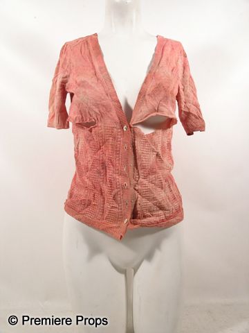 Outrage: Born in Terror - Christine (Katie Fountain) screen worn, hero, bloody, dirty, and ripped, missing buttons on the front, short sleeve 'Lux' cardigan sweater. (size M)