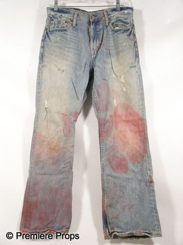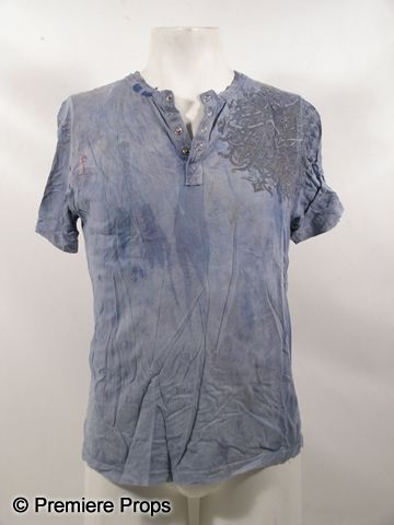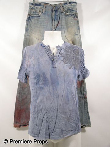 Outrage: Born in Terror - Trey (Ace Cruz) screen worn, hero, dirty, blue with black design on left shoulder, snap buttons on the neck, 'Pop Icon' t-shirt, (size M) and dirty light blue 'American Eagle' denim jeans. (no size)