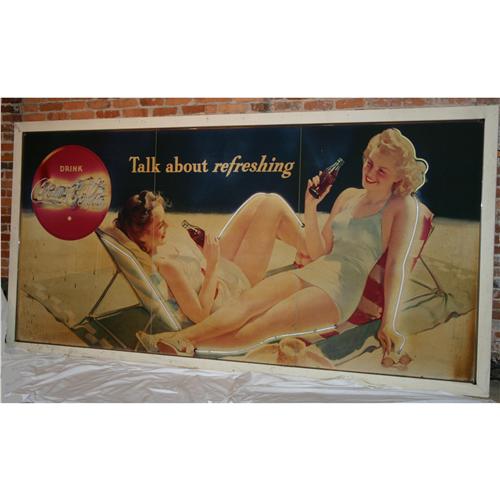 Outside, extra large, advertising neon sign with Coke Logo measuring approximately 70"  x 139" W.  Sign depicts lovely ladies in circa 1950's swimsuits.  Neon surrounds the outside perimeter.