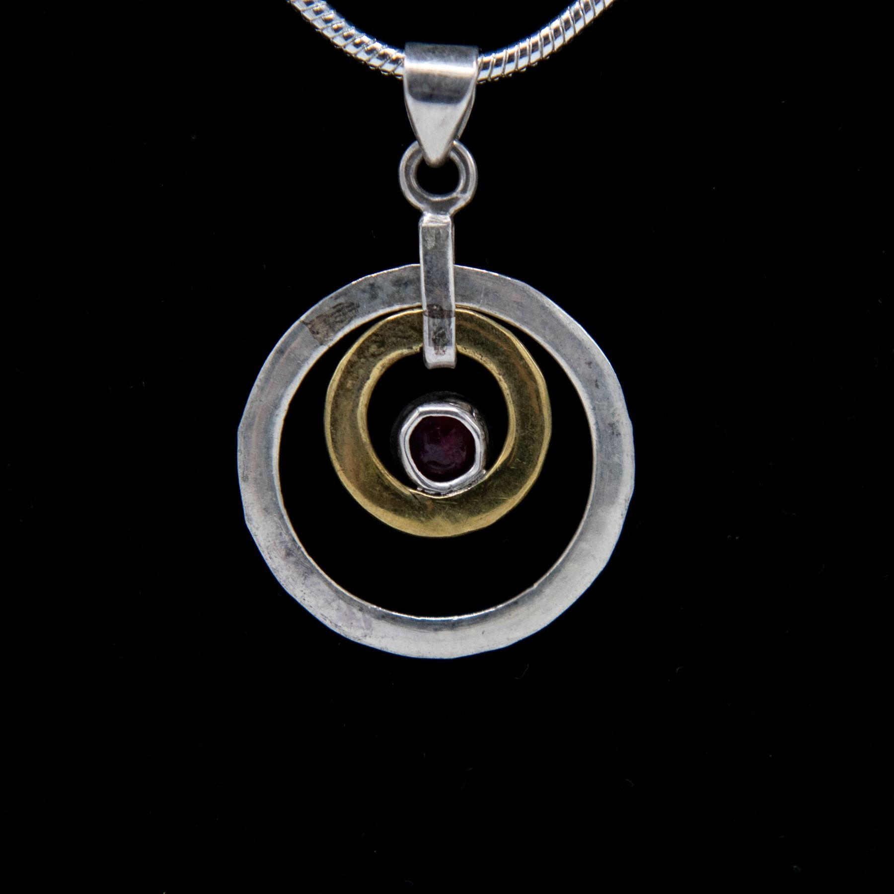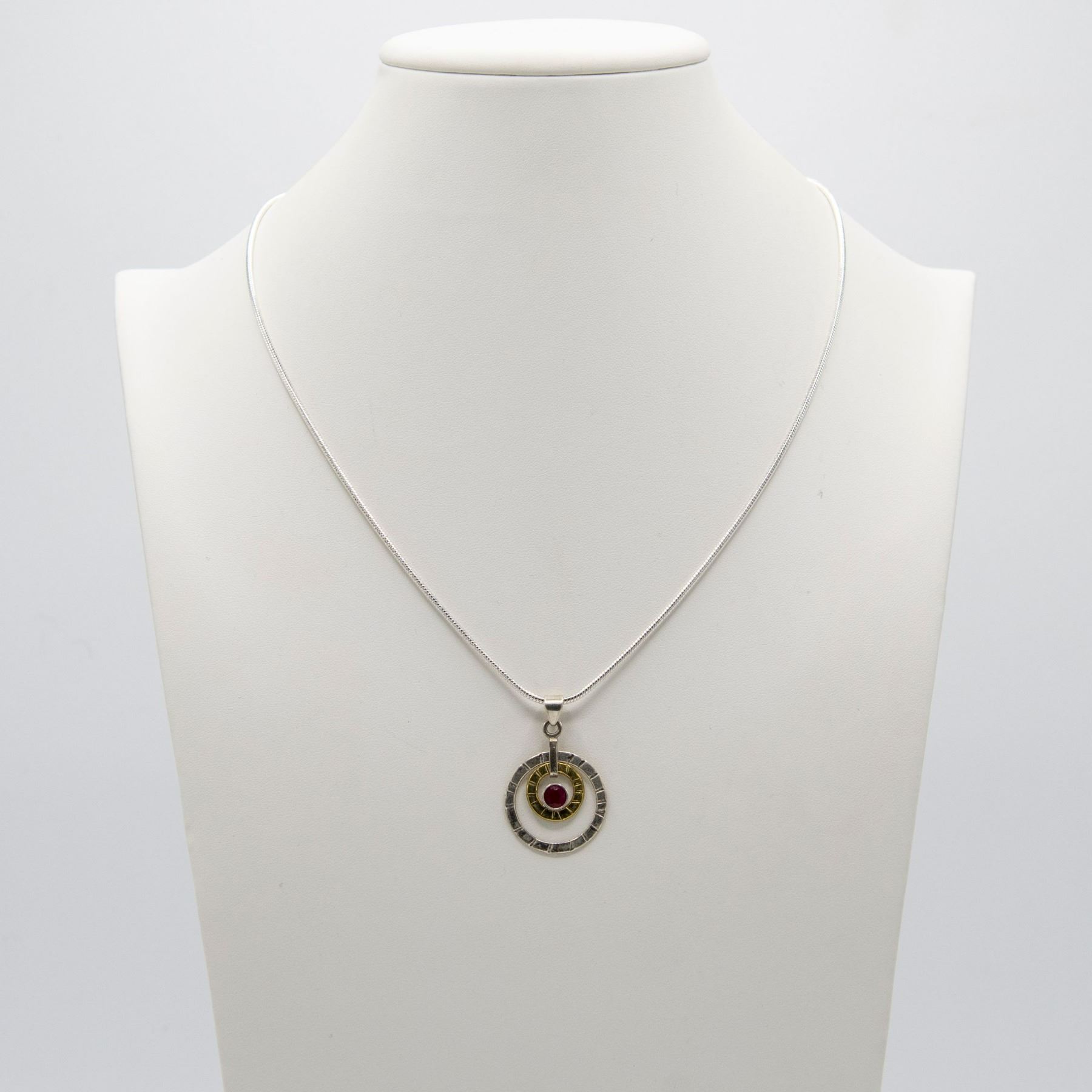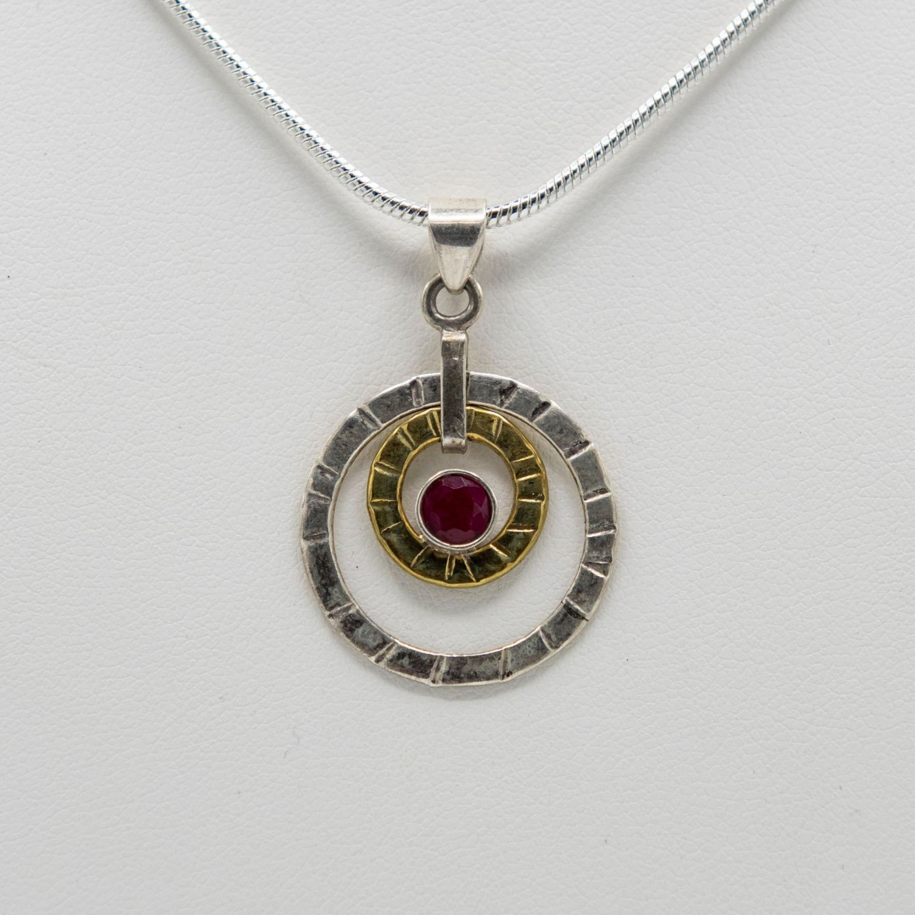 Outstanding 1 Ct Sterling Silver Ruby Pendant. Mounted In Elaboratly Designed Solis Stamped .925 Sterling Silver. Partially Accented With A 14 Kt Gold Overlay. Includes 20 " Long 2 Mm Chain 61.50 Cttw Or 12.3 Total Grams. Very Eye Catching And Unique.