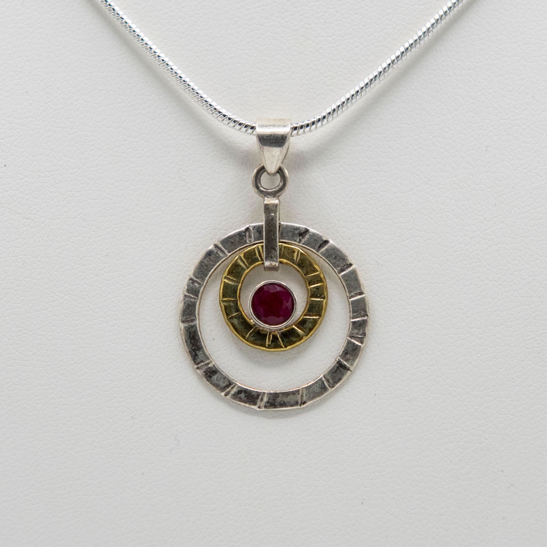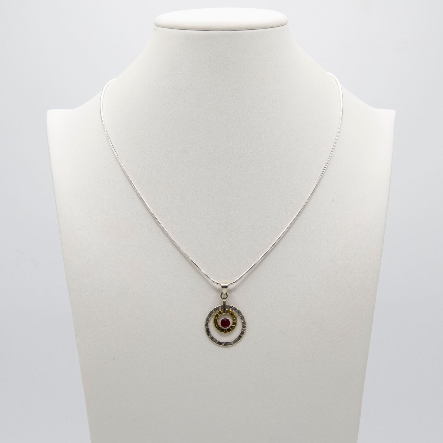 Outstanding 1 Ct Sterling Silver Ruby Pendant. Mounted In Elaboratly Designed Solis Stamped .925 Sterling Silver. Partially Accented With A 14 Kt Gold Overlay. Includes 20 " Long 2 Mm Chain 61.50 Cttw Or 12.3 Total Grams. Very Eye Catching And Unique.