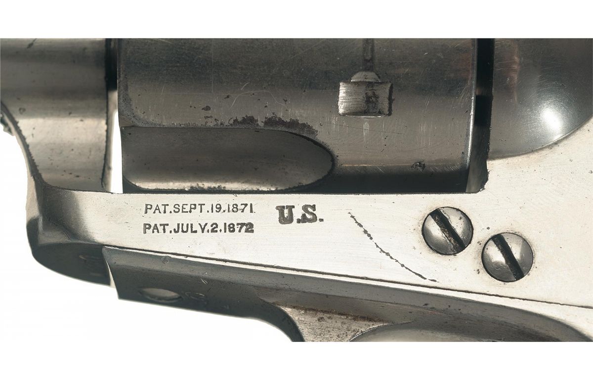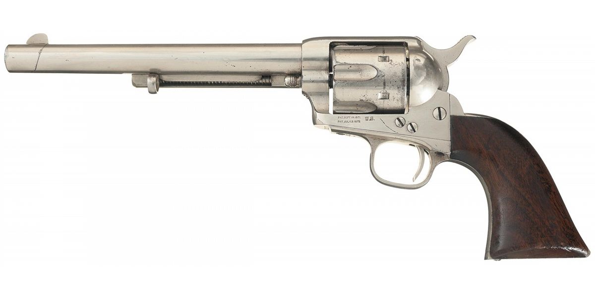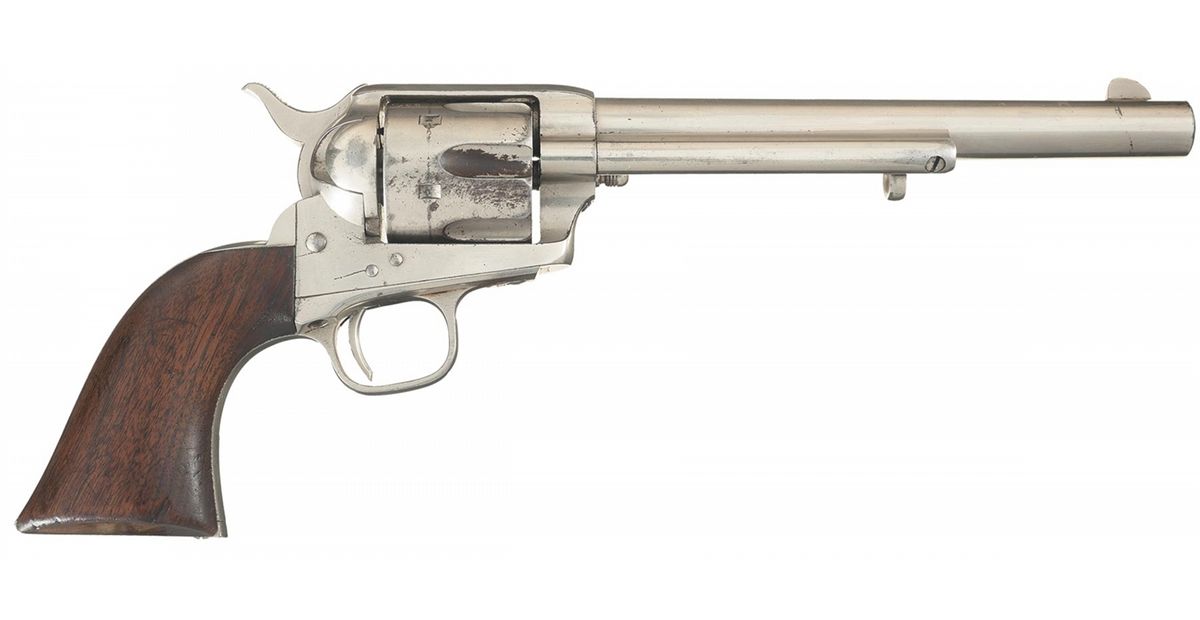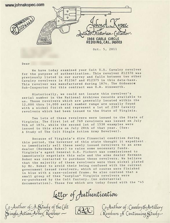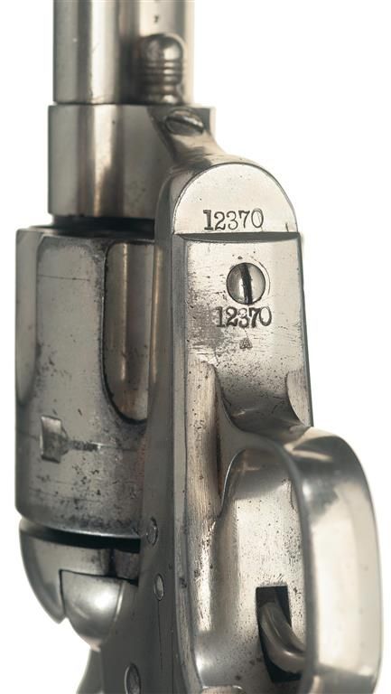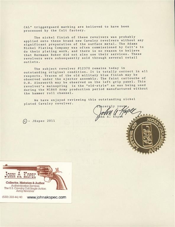 This is a highly desirable example of a Colt U.S. contract Cavalry Model Single Action Army revolver with nickel plated finish that was manufactured in 1874. The revolver is accompanied by a Letter of Authentication by Colt Single Action Army expert John A. Kopec which states that the serial number of this revolver, "12370" falls within the 12,000-14,000 serial number range in which most nickel plated U.S. contract Single Action revolvers are located. The letter further states that this revolver was probably one of the 2,307 Cavalry revolvers issued to the State of Virginia in 1874 that were subsequently resold to arms dealer Herman Boker by Virginia and repurchased by Colt. Kopec notes that the Virginia revolvers were probably nickel plated by the Adams Nickel Plating Co., which did Colt's nickel plating and then resold through several retail outlets. Kopec's letter states that the original military blue finish is visible under the ejector housing, a faint O.W. Ainsworth Ordnance inspection stamp is visible on the left grip panel and that the revolver retains the old-style Model 1860 Army mainspring. The revolver has a full nickel plated finish with one piece walnut grip. The ejector rod has the early bull's-eye head and the ejector housing has the early barrel boss. The cylinder has the small bolt stops and guides, and the hammer has elongated bordered knurling on the spur. The top of the barrel is marked with the early script address "+COLT'S F. A. PT. MFG. Co. HARTFORD. CT. U.S.A.+" with slanted crosses at either end and the left side of the frame is marked with Colt's two line, two patent date marking followed by the "U.S." property mark. The complete matching serial number is marked on the bottom of the frame, trigger guard and back strap, and the partial serial number "2370 is marked on the cylinder and barrel under the ejector housing. The assembly number, "747" is stamped on the inside of the loading gate. Small "P" proofmarks are stamped on the underside of the barrel and the side of the cylinder. The small "A" sub-inspection mark of Ordnance Sub-Inspector Orville W. Ainsworth is stamped on the underside of the barrel ahead of the proofmark, on the trigger guard below the serial number, on the top of the back strap behind the hammer and on the side of the cylinder. A Colt "C" inspection mark is stamped in the hammer slot and on the rear face of the cylinder.