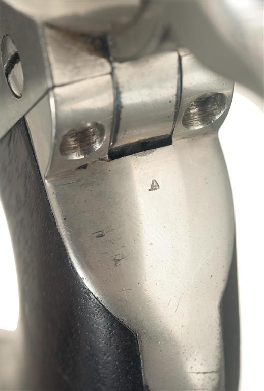 Extremely fine. The revolver retains 90% of the nickel plated finish. There is light-moderate finish wear and flaking on the barrel beneath the ejector housing, on the trigger guard ahead of the bow, on the cylinder edges and flutes and on the contact point of the back strap. All of the markings are crisp. The grip is fine. The action is excellent. The Kopec letter describes this revolver as an "outstanding nickel plated Cavalry revolver" in "outstanding original condition" and states that the revolver is "totally correct in all respects". This is an excellent example of a scarce Ainsworth-inspected, U.S. contract Cavalry Model Single Action with nickel plated finish.