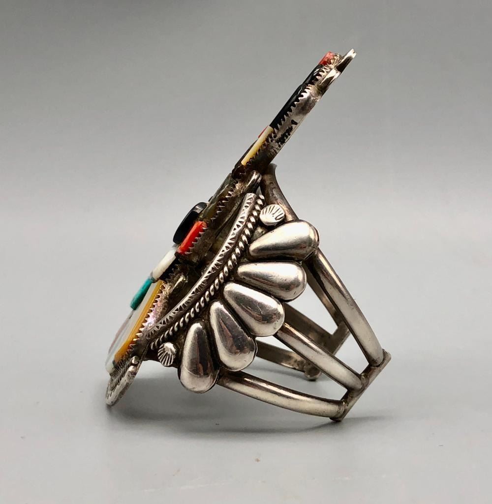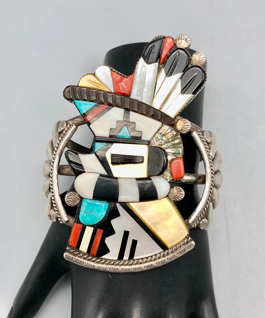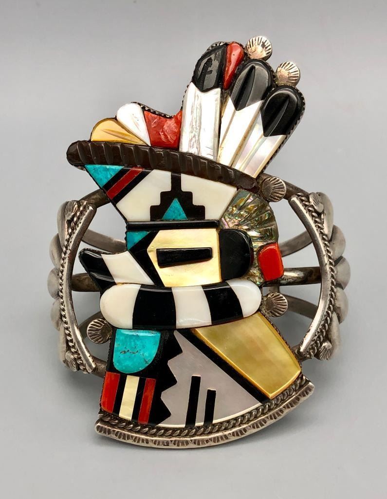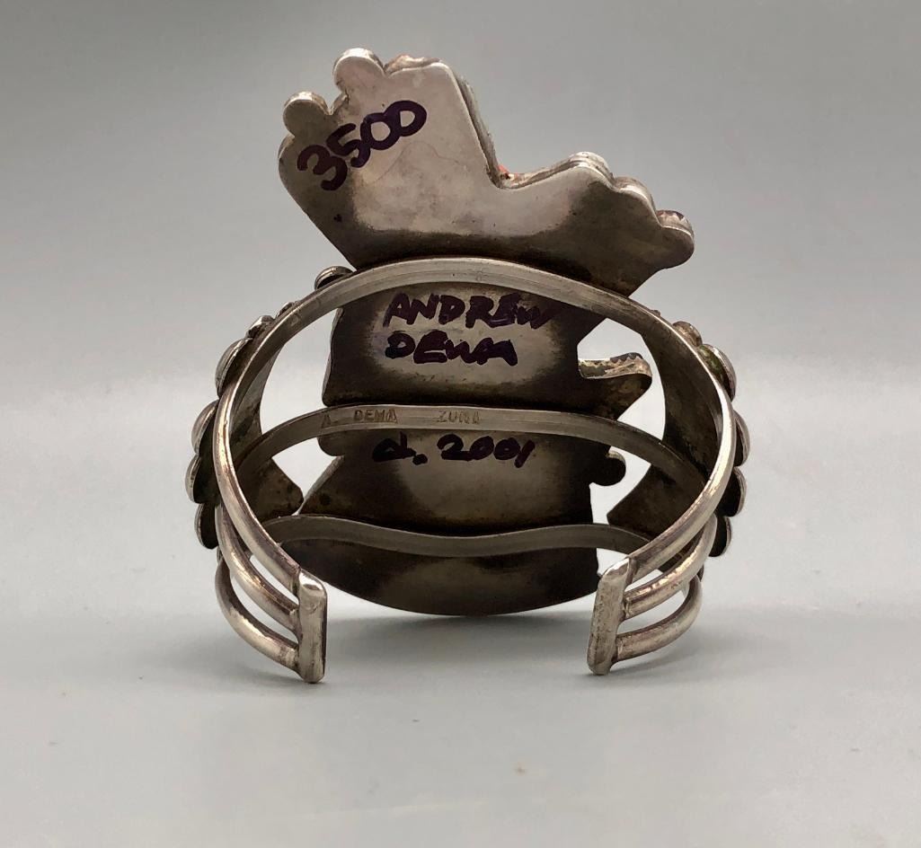 Presented for sale in this lot is an outstanding Andrew Dewa inlay bracelet. This is a gorgeous ceremonial figure set with turquoise, coral, onyx, and various shells. It has beautiful carved and raised details that are accented with nice silverwork, giving the piece some dimension. The settings are flush and well fitting which really showcases the artist's talent. It is sterling silver. MAKER: Hallmarked A. Dewa. Andrew Dewa (?-2001; Zuni). Active since 1960s-2001. APPROX AGE: Circa 1970s. SIZE: Inside circumference measures 5-3/8 inches long. Opening is an additional 1-1/4 inches, fitting a 6-5/8 inch wrist. Width is 3-5/8 inches. Weighs 87.7 grams. CONDITION: Good for its age, normal wear expected. Please look closely at the pictures as they are an important part of our description and are hereby incorporated into the description, specifically with regards to condition. SHIPPING: There will be a $5 handling / packaging fee for shipping this lot. The actual cost of postage will be added on top of that. BUY IT NOW: If you would like to buy this item now, without waiting for the auction day to bid on it, we do offer this option (which is available up to 48 hours before the actual auction starts). The “Buy it Now†price is the high estimate of this lot (plus applicable fees and the Buyer's premium is discounted to 10% when using the Buy it Now option). If you would like to exercise this option, you must contact us by email (or phone as long as you talk to someone live). Reference this lot number and your intention to "Buy it Now."