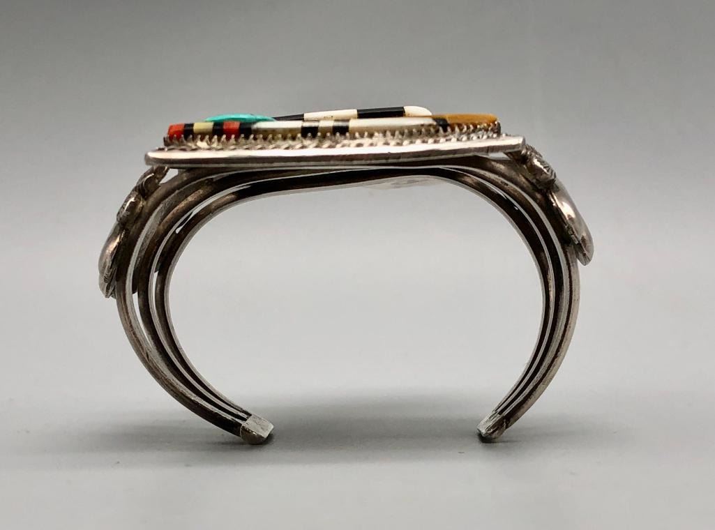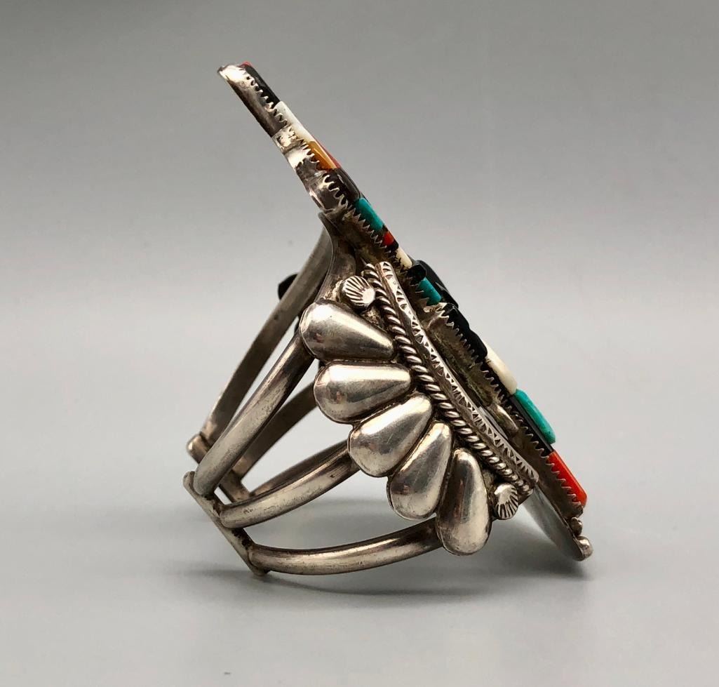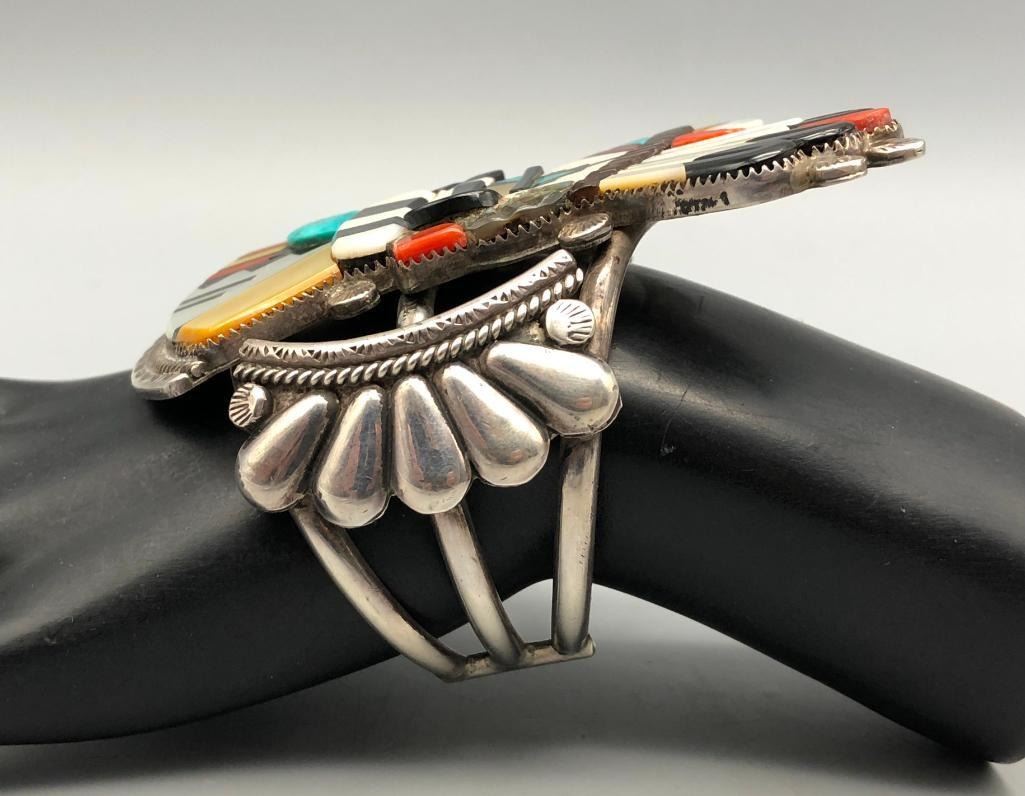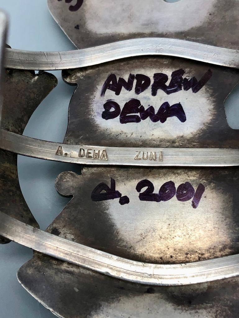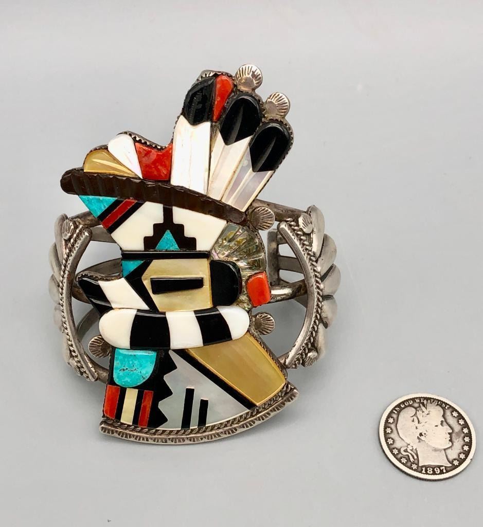 Presented for sale in this lot is an outstanding Andrew Dewa inlay bracelet. This is a gorgeous ceremonial figure set with turquoise, coral, onyx, and various shells. It has beautiful carved and raised details that are accented with nice silverwork, giving the piece some dimension. The settings are flush and well fitting which really showcases the artist's talent. It is sterling silver. MAKER: Hallmarked A. Dewa. Andrew Dewa (?-2001; Zuni). Active since 1960s-2001. APPROX AGE: Circa 1970s. SIZE: Inside circumference measures 5-3/8 inches long. Opening is an additional 1-1/4 inches, fitting a 6-5/8 inch wrist. Width is 3-5/8 inches. Weighs 87.7 grams. CONDITION: Good for its age, normal wear expected. Please look closely at the pictures as they are an important part of our description and are hereby incorporated into the description, specifically with regards to condition. SHIPPING: There will be a $5 handling / packaging fee for shipping this lot. The actual cost of postage will be added on top of that. BUY IT NOW: If you would like to buy this item now, without waiting for the auction day to bid on it, we do offer this option (which is available up to 48 hours before the actual auction starts). The “Buy it Now†price is the high estimate of this lot (plus applicable fees and the Buyer's premium is discounted to 10% when using the Buy it Now option). If you would like to exercise this option, you must contact us by email (or phone as long as you talk to someone live). Reference this lot number and your intention to "Buy it Now."