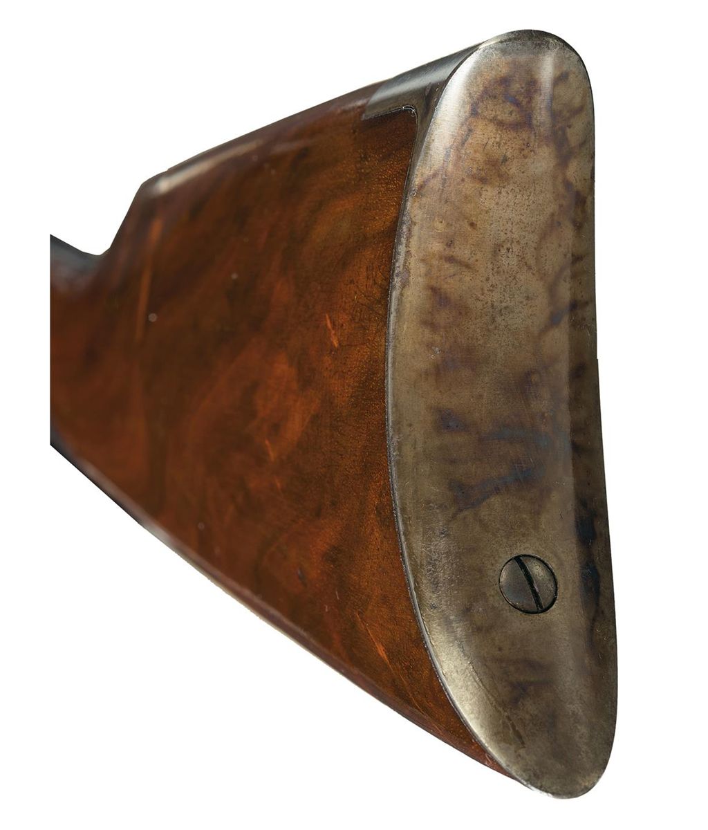 Excellent condition with 99% of the original blue finish with just a hint of minor flaking on top of the receiver ring and the tail end of the lower tang. The balance of the metal finish is exceptional. The stock and forend are the same with 98% of the original stock varnish with some minor rub marks on the right side of the buttstock mixed with some minor handling marks/scratches. The buttplate and hammer retain 98% of their case colors. This is a fabulous, highly desirable rifle in beautiful condition with all the screws untouched with some old dried grease at the junction of the barrel and forend.