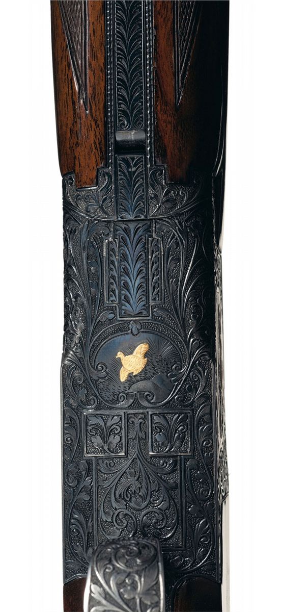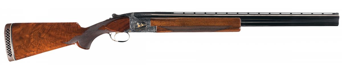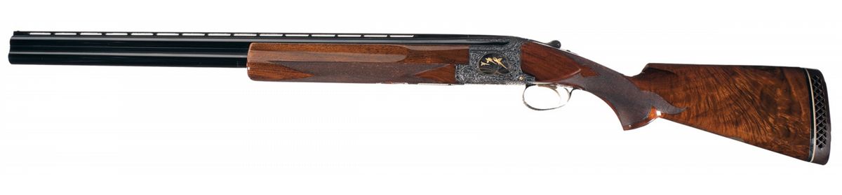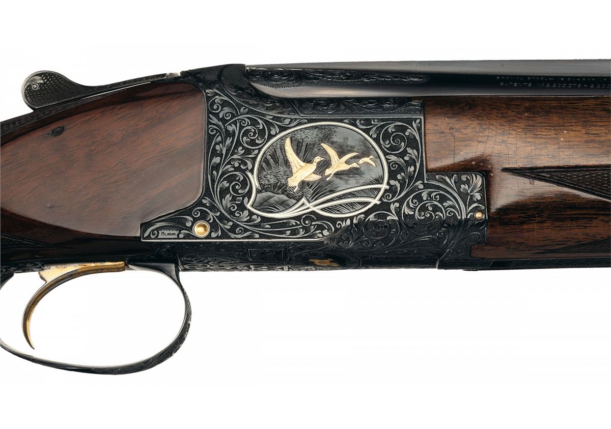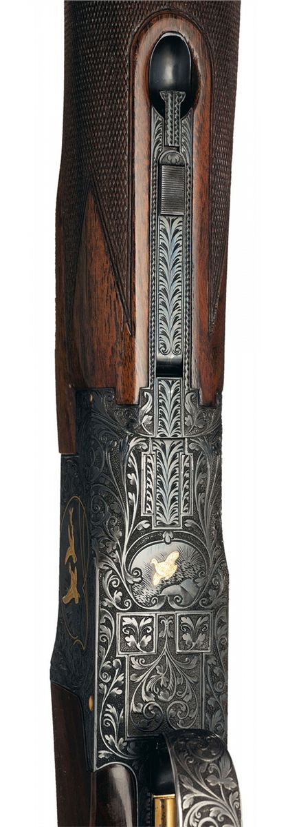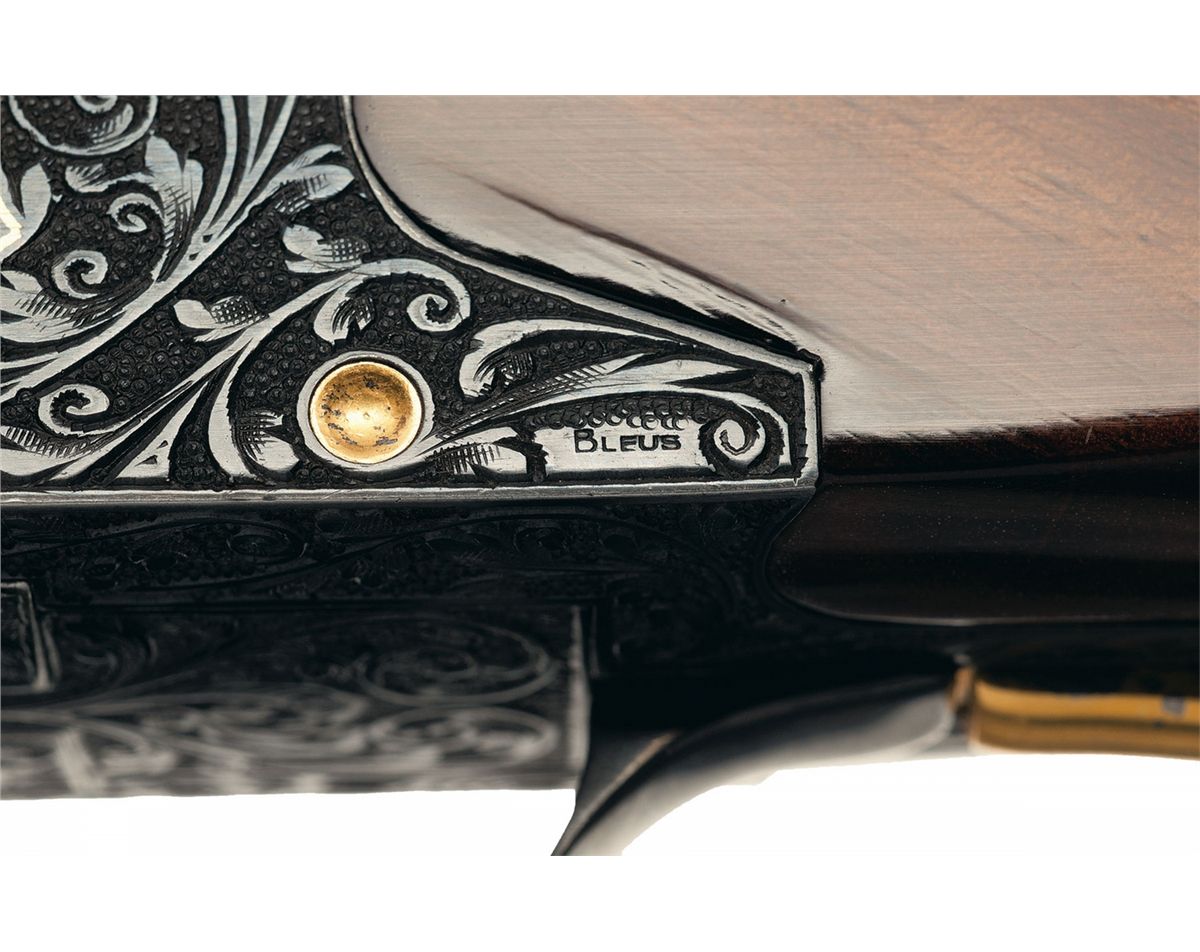 Manufactured in 1967. Dual ivory beads on the matte vent rib, choked skeet/skeet with 2 3/4 inch chambers and ejectors. The top breech end sides of the top barrel featured floral scroll engraving with a punch dot background. The receiver, trigger guard, break lever and forearm hardware also feature floral scroll engraving with a punch dot background. In addition the left side of the receiver has three gold inlaid pheasants with a gold in laid wire border, the right side has three gold inlaid ducks with the same border and the bottom has a gold inlaid quail. The lower rear sides of the receiver is signed "BLEUS". The shotgun comes with a titanium three gauge set in 410, 28, and 20 gauge barrel tubes. Gold washed single trigger, tang mounted safety/selector with gold "S", "O" and "U". Mounted with an extra fancy high gloss walnut checkered forearm and pistol grip stock with a vented Browning recoil pad and gold initial oval. Complete in a John Hall takedown plastic combination locking case with brown lining, with compartments for the shotgun and all the tubes. Length of pull is 14 5/8 inches.